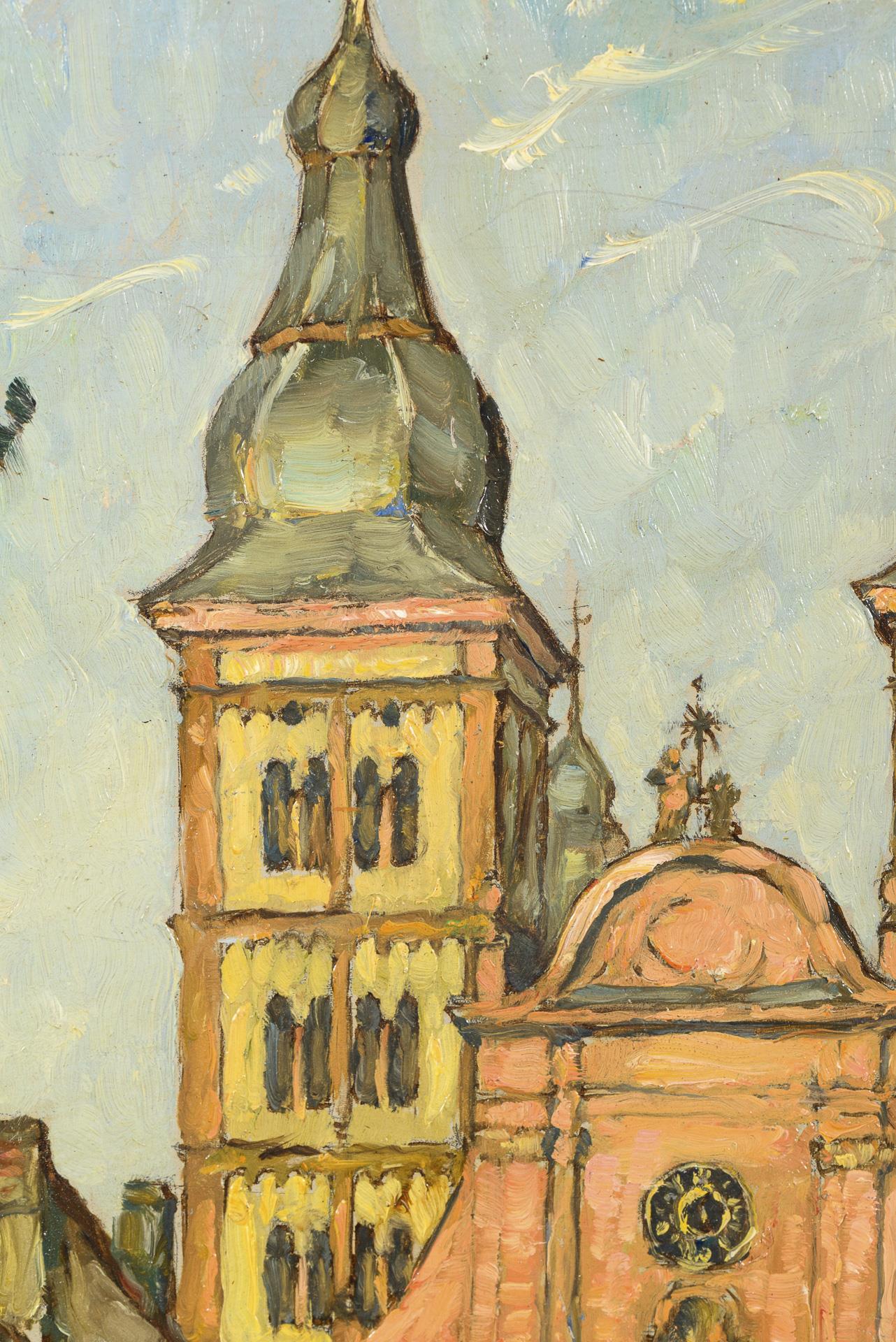 Straßenszene der Altstadt mit Reihenhäusern vor der Kirche. Minimale Altersspuren.