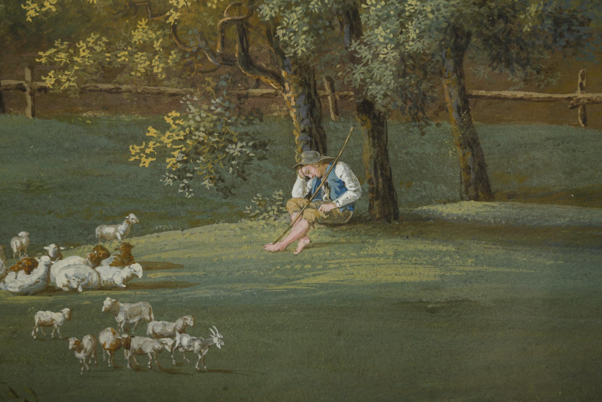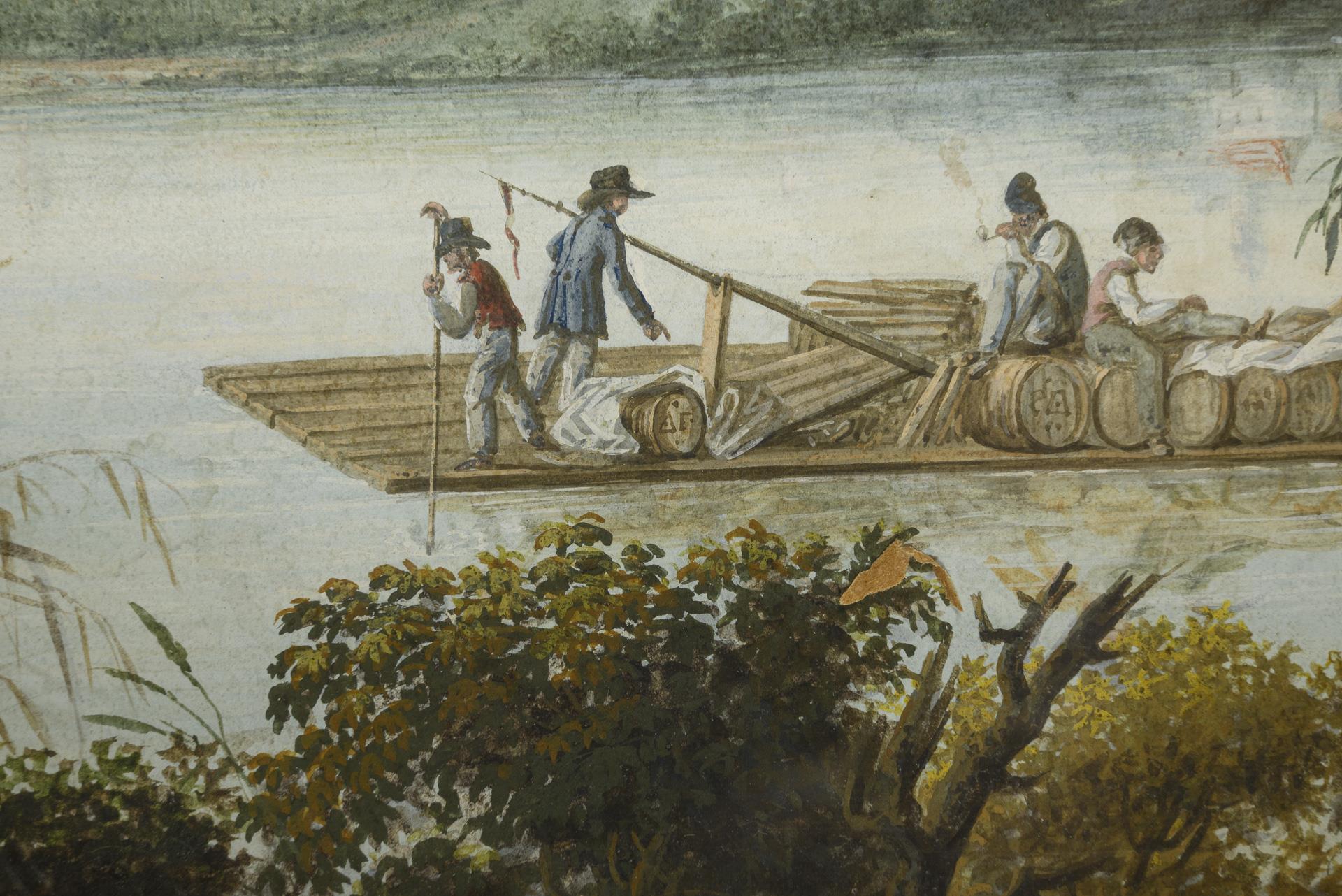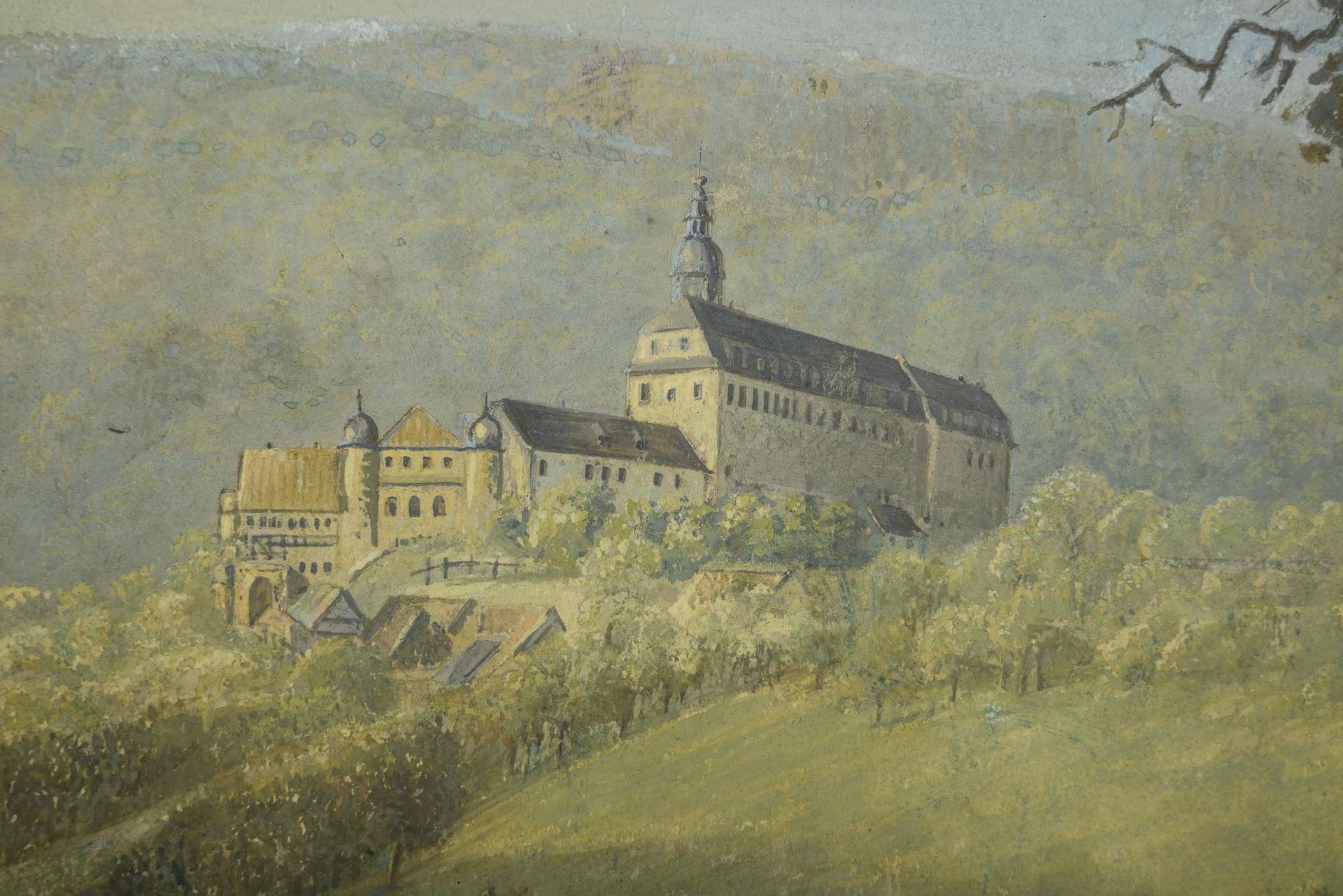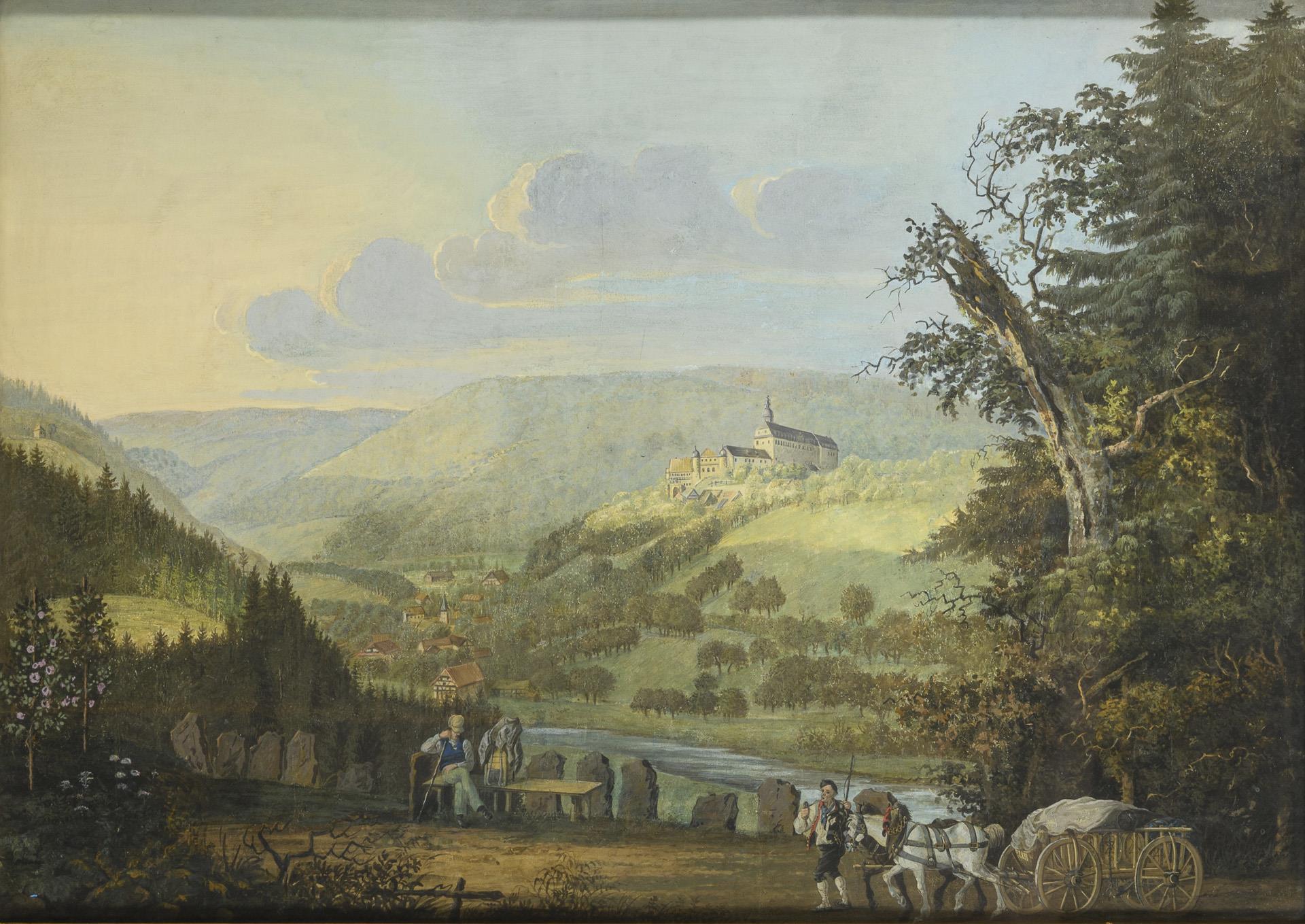 Je Darstellung von Staffagefiguren in grüner Wald- und Flusslandschaft unter wolkigem Himmel. Einmal Darstellung des Thüringer Waldes mit der Schwarzburg. Minimale Altersspuren.