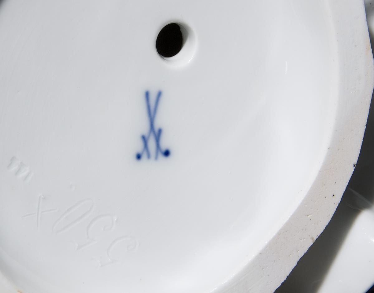 Modell von Johann Joachim Kaendler 1744. Farbig bemallt, gold stafiert. Ritzmarke, Pressmarke, Malermarke, Schwertermarke 1. Wahl. Rückseitig Rocksaum an einer Ecke unten, eine Hand restauriert.