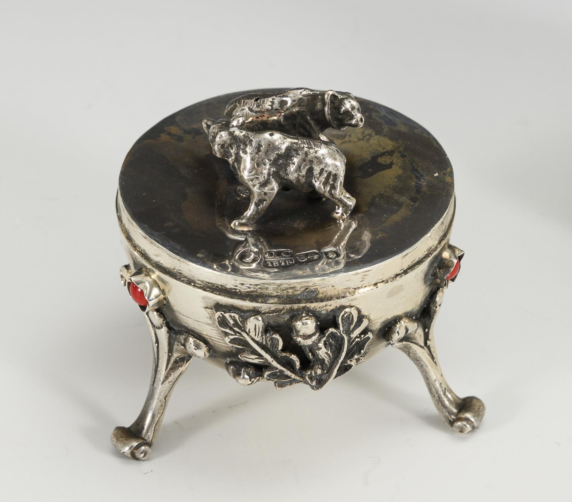 Reich reliefiertes Ei mit Farbsteinbesatz, auf 3 Füßchen. Deckel minimal gedellt.