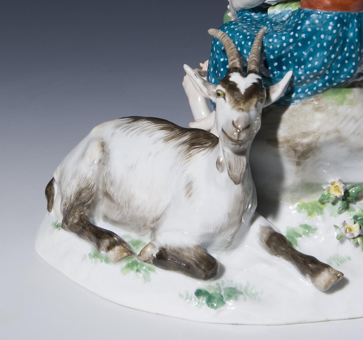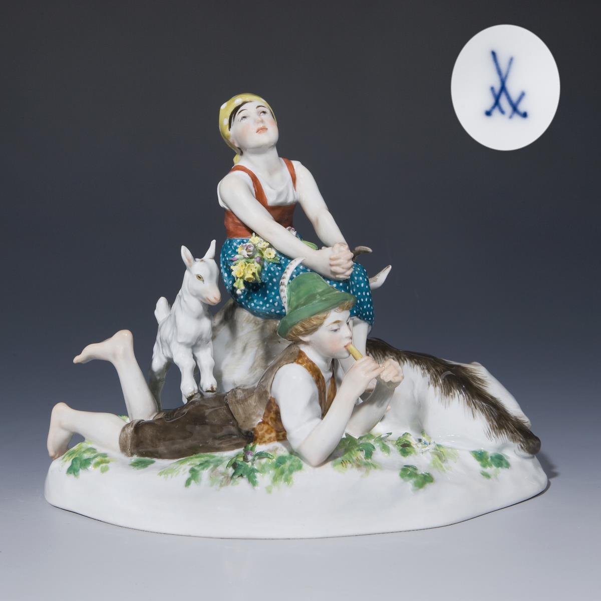 Modell von Erich Hösel 1905-1910. Farbig bemalt. Ritzmarke, Pressmarke, Malermarke, Schwertermarke 1. Wahl. Rückseitig am Sockel über zwei Ziegenbeine Haarriss. Wenige Blätter bestoßen.