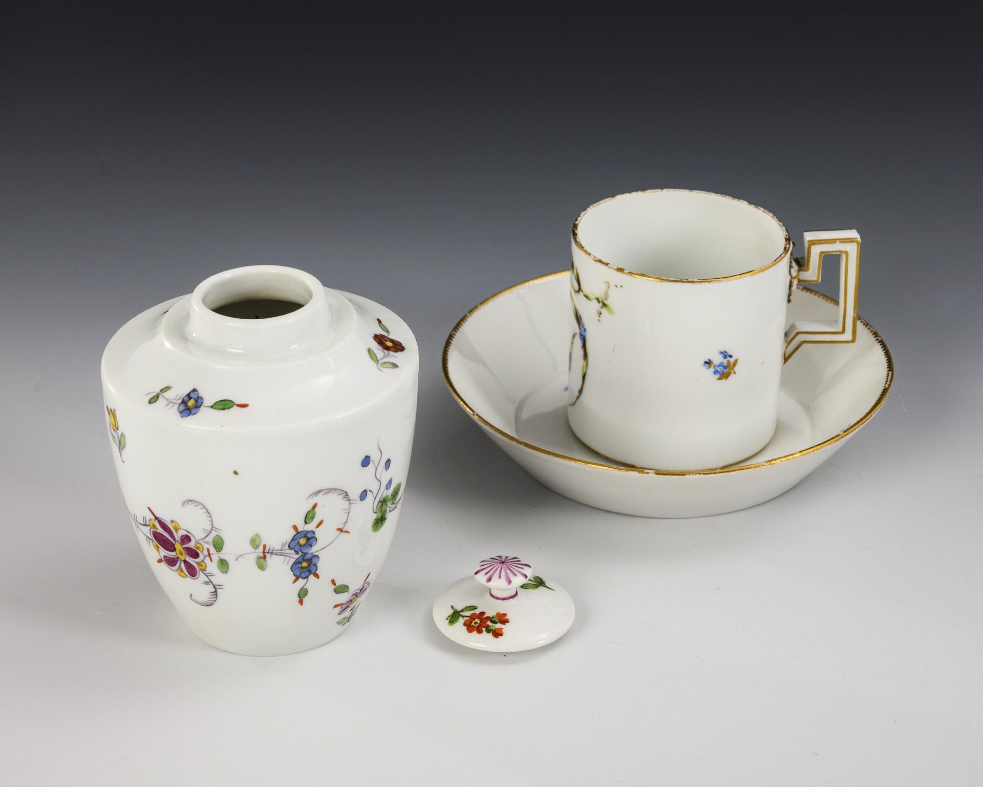 Polychrom bemalt, 1x goldstaffiert. Teedose (H 11 cm), Tasse (H 6,5 cm) mit originaler Untertasse (Ø 13,5 cm).