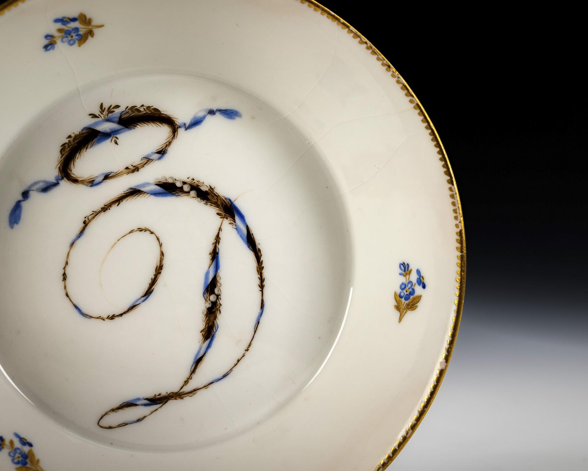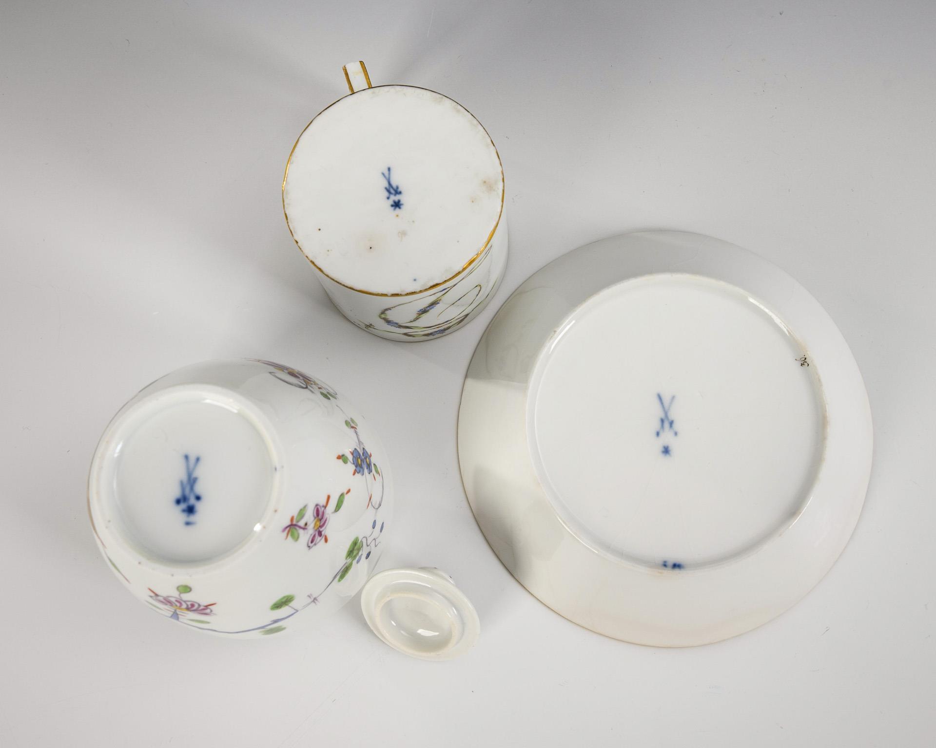 1x ovoide Dose mit Knaufdeckel und Fels- und Vogelmalerei. / 1x Zylindertasse mit gewinkeltem Henkel und Untertasse: schauseitig der aus gemalten Haaren, grünem Band und Vergissmeinnichtblüten gebildete Buchstabe "D". Untertasse haarrissig, Gold berieben.