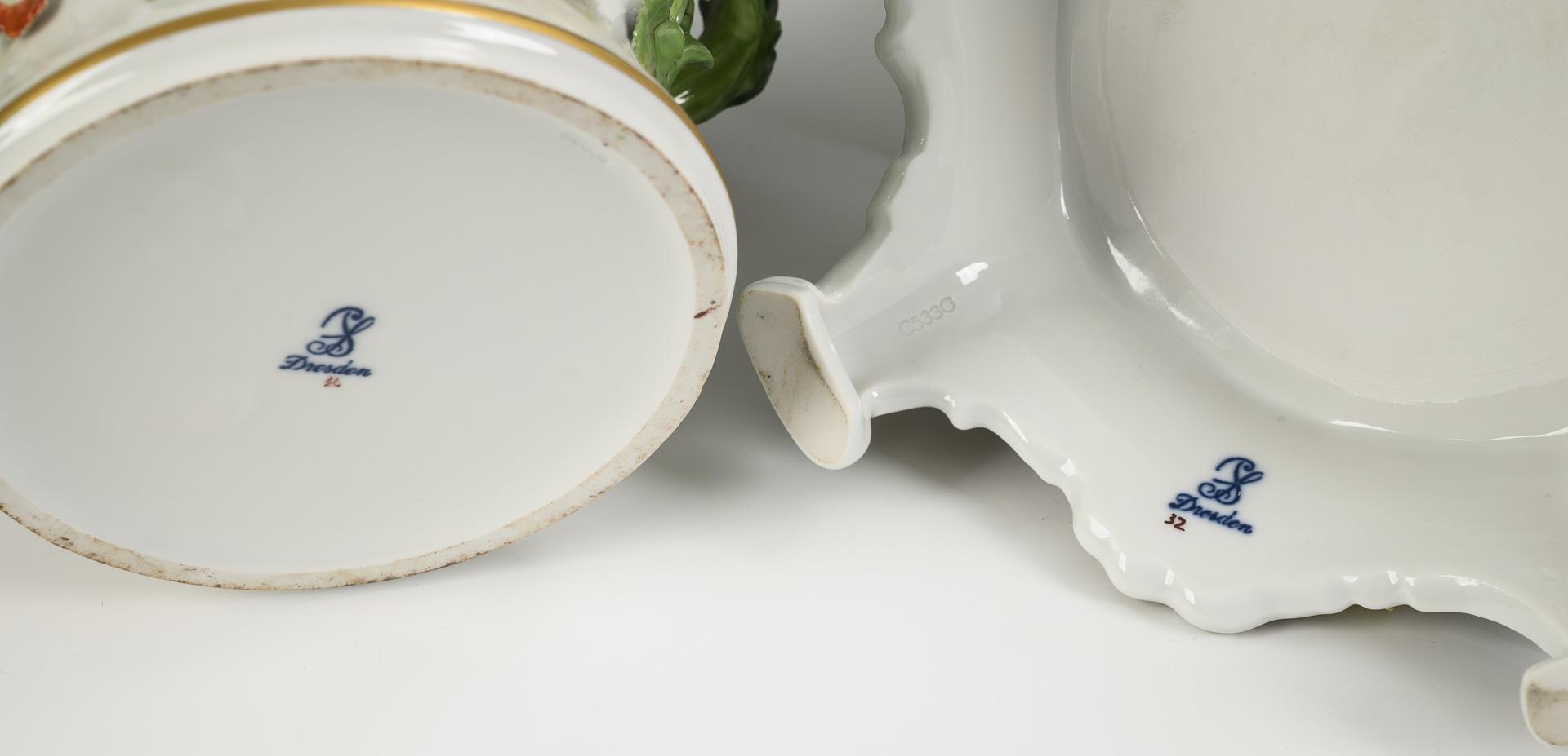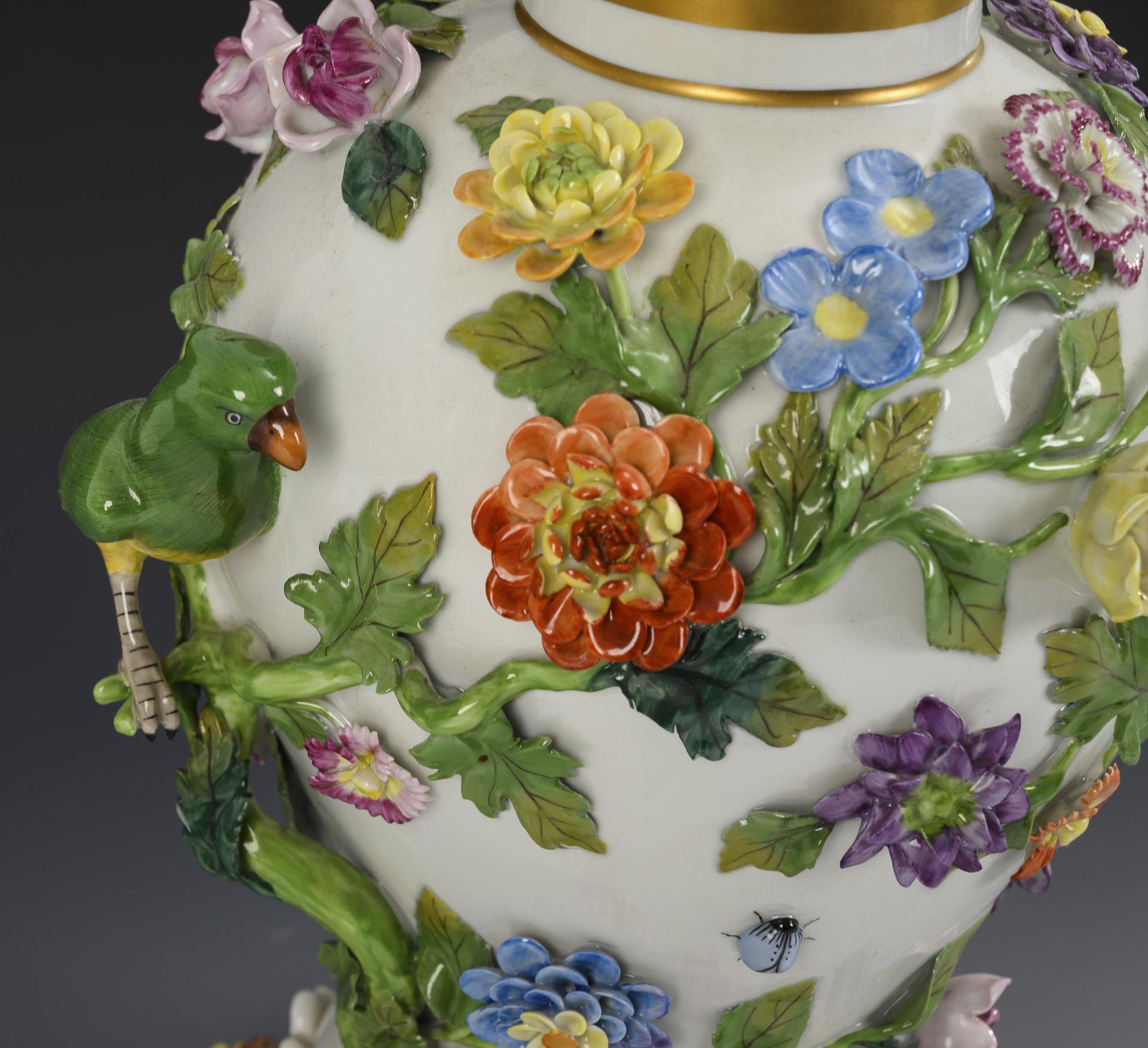 Balustervase mit reichem Blütenbelag, zwei an der Vase sitzenden Vögeln, Knaufdeckel und Sockel. 2 Blütenblätter bestoßen.