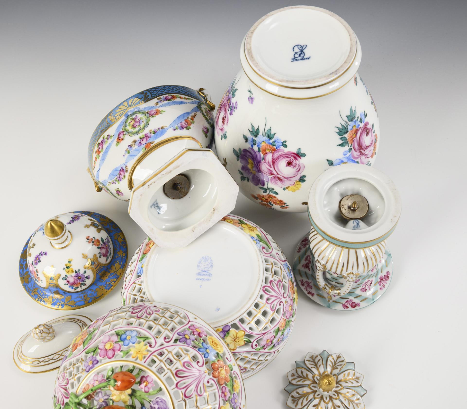 3 Deckelvasen Potschappel und und 1 Potpourridose Herend.