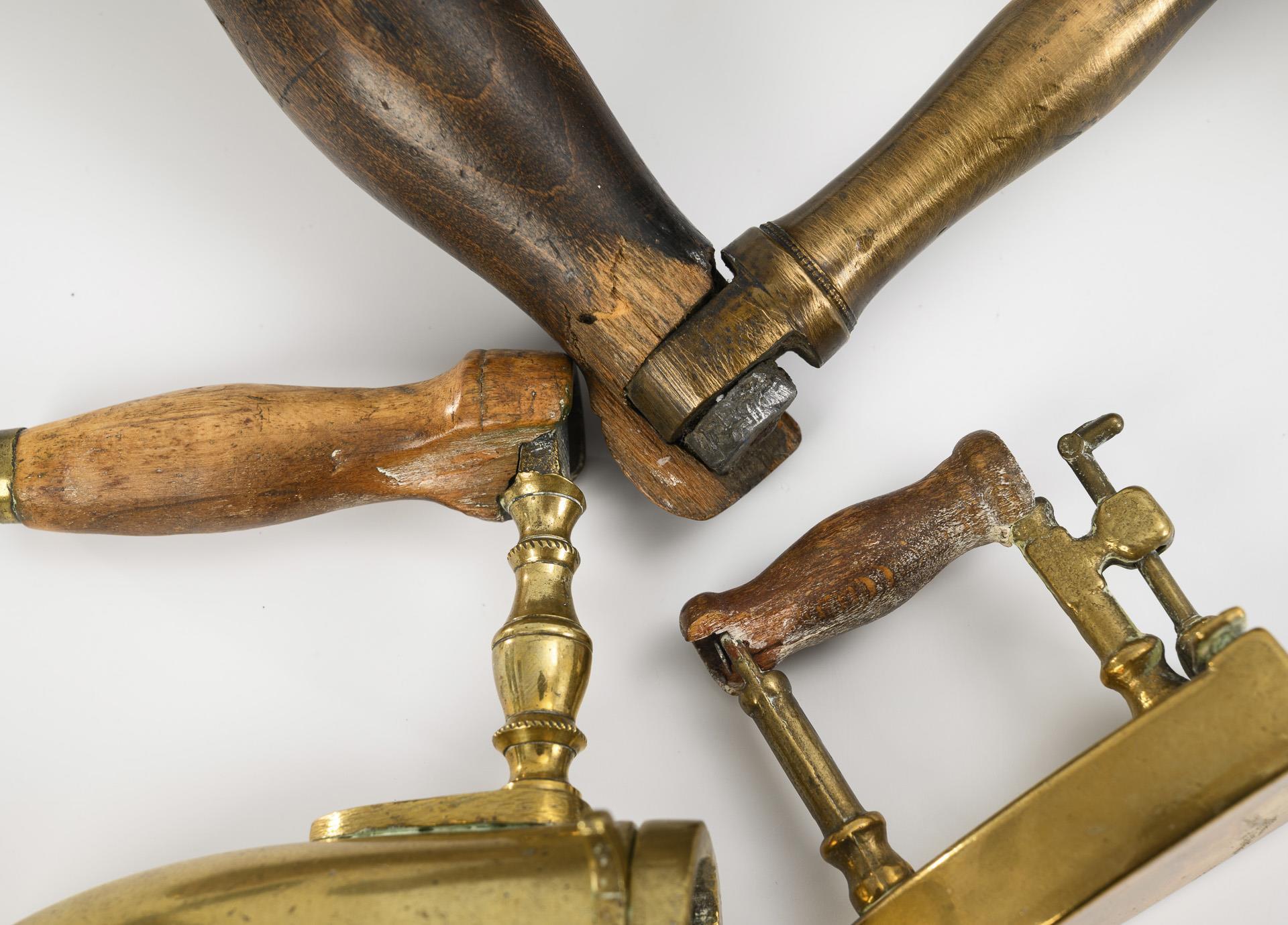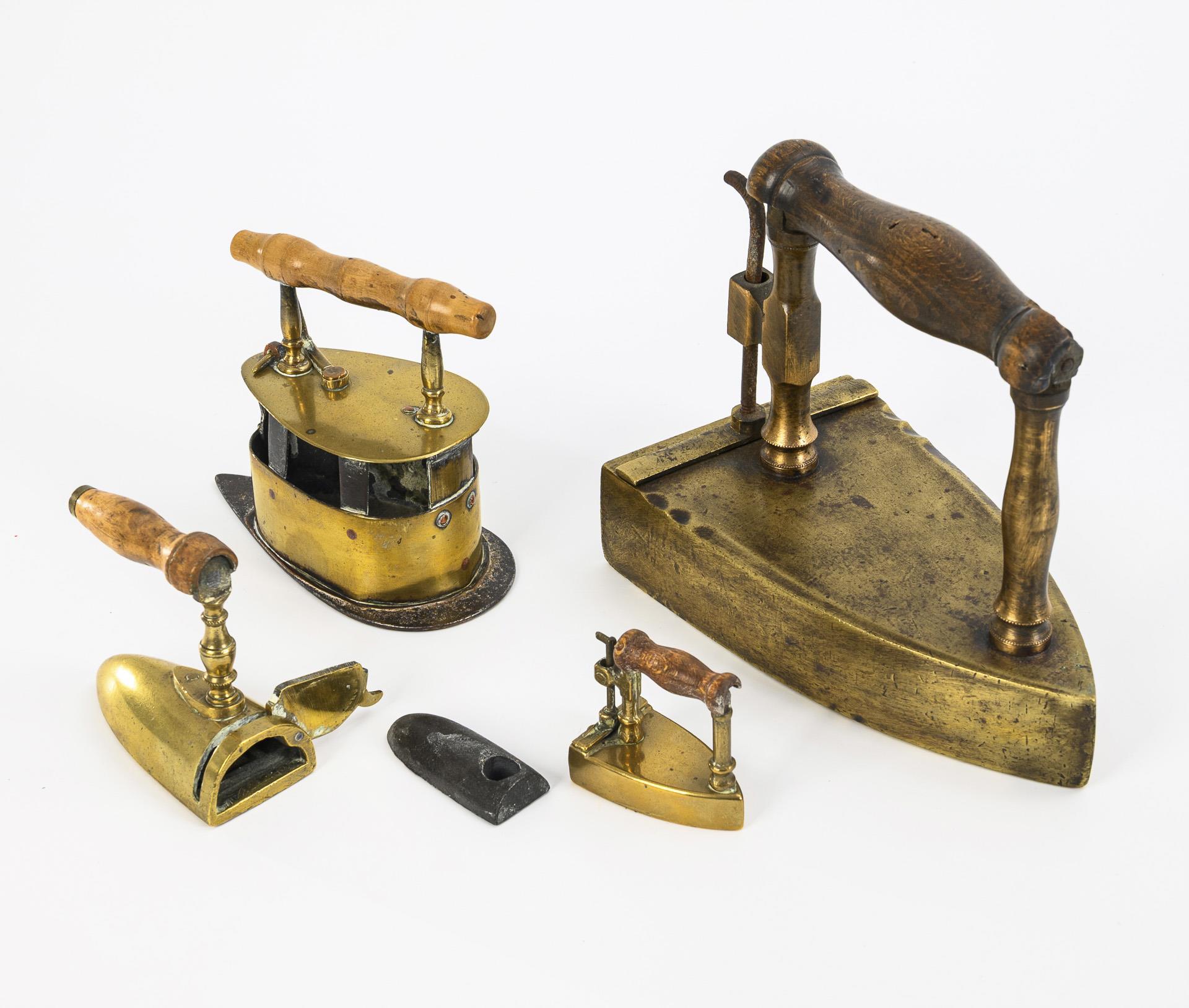 4 Bügeleisen, 3x keilförmige Kasteneisen, ein Bügeleisen mit Deckelverschlussmechanismus. Je mit gedrechselten Holzgriffen an balusterartigen Stegen. Alters- und Gebrauchsspuren. Das kleinste sowie das größte Bügeleisen mit Ausbrüchen am Griff, an letzterem leichter, inaktiver Anobienbefall, 3x ohne, das zweitkleinste Eisen mit Kern.
