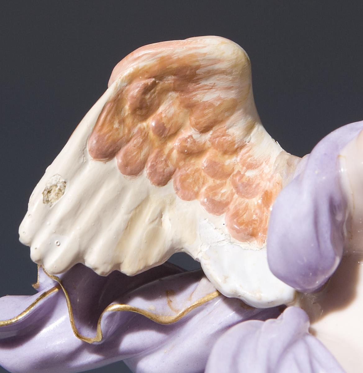Modell von Michel Victor Acier 1779-1781. "Je mets les calme". Farbig bemalt, gold staffiert. Ritzmarke, Pressmarke, Malermarke, Schwertermarke 1. Wahl. Ein Flügel sichtbar alt restauriert, ergänzt.