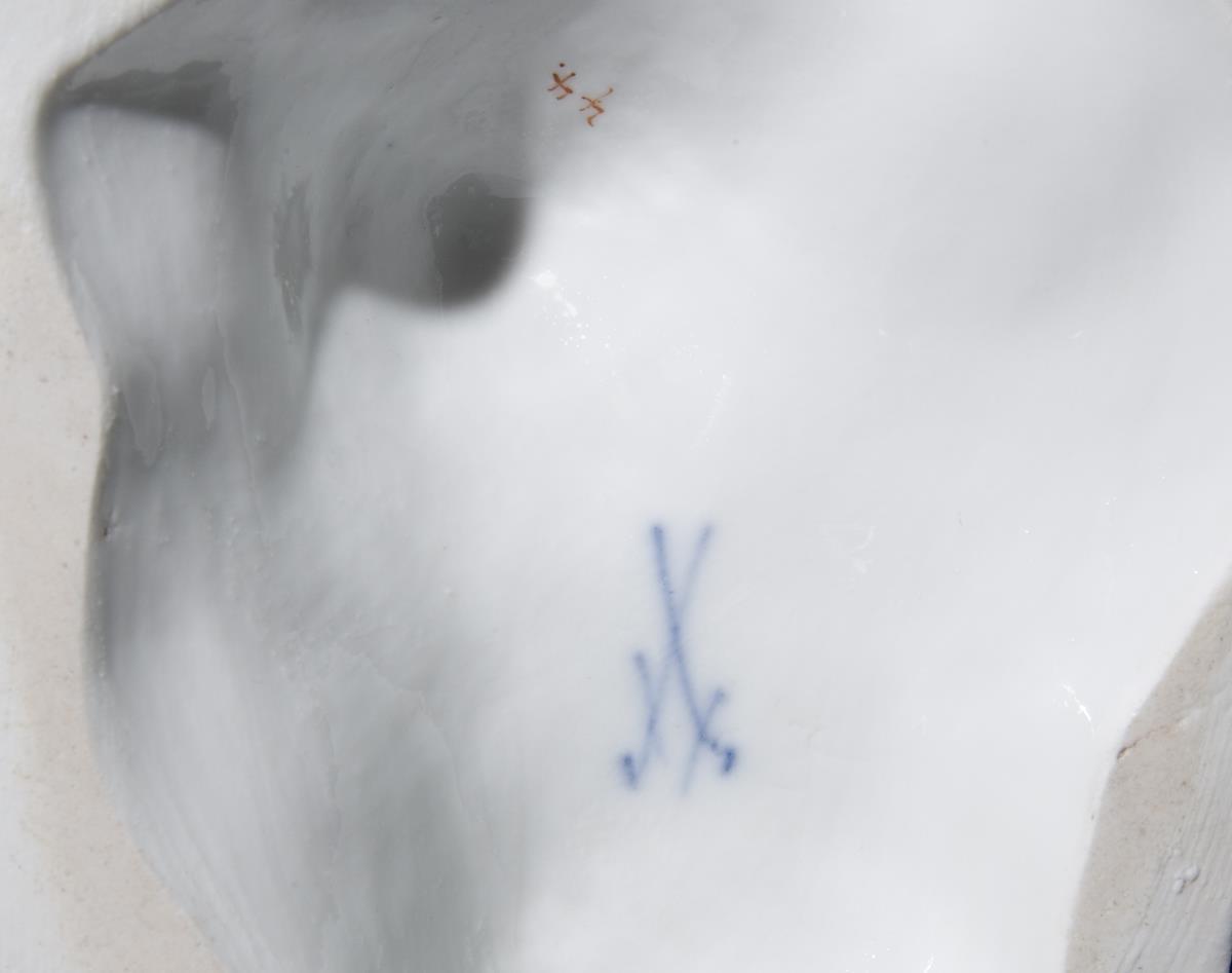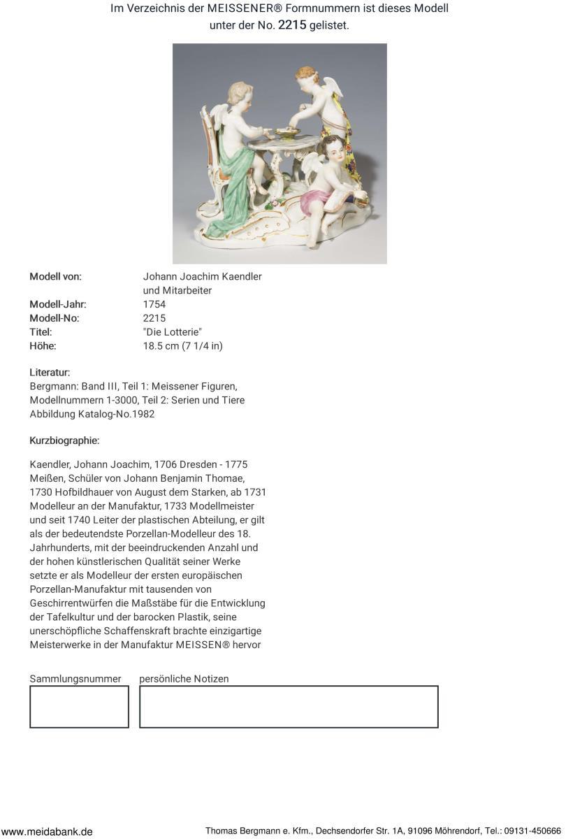Modell von Johann Joachim Kaendler und Mitarbeiter 1754. Die kindlichen Liebesgötter verlosen mit schalkhafter Emsigkeit wer von den Liebespfeilen ins Herz getroffen werden soll. Farbig bemalt, gold staffiert. Ritzmarke, Malermarke, Schwertermarke 1. Wahl.