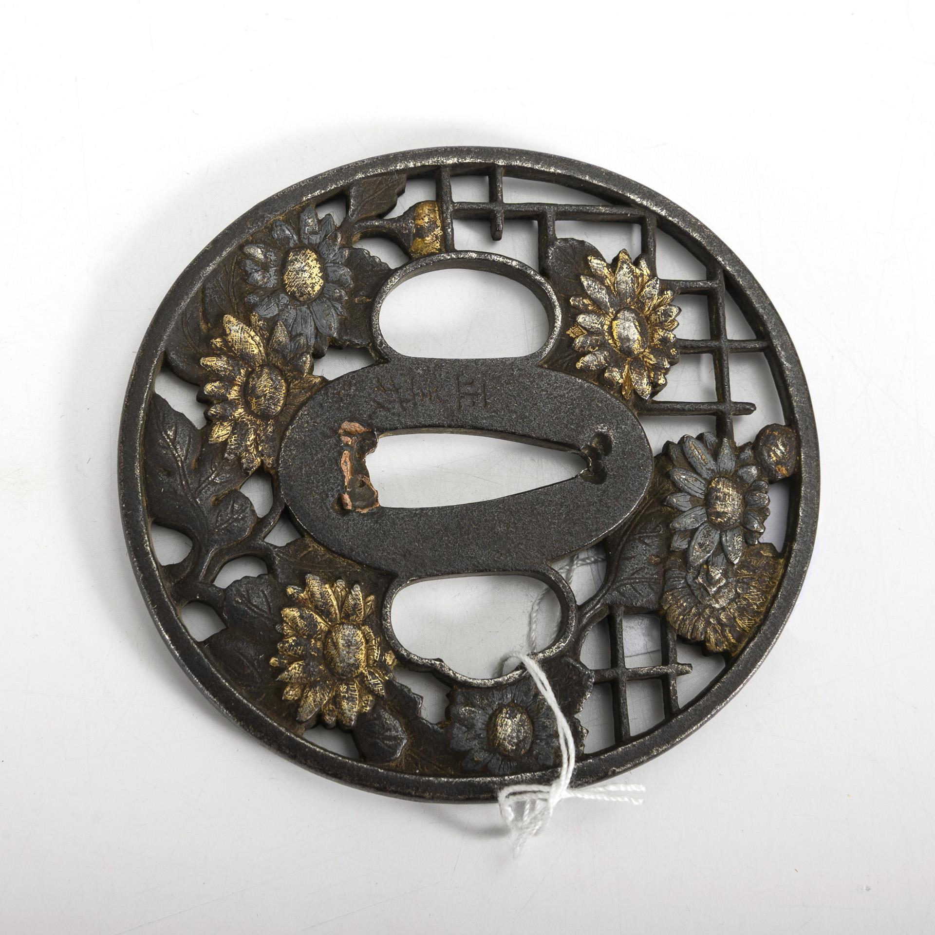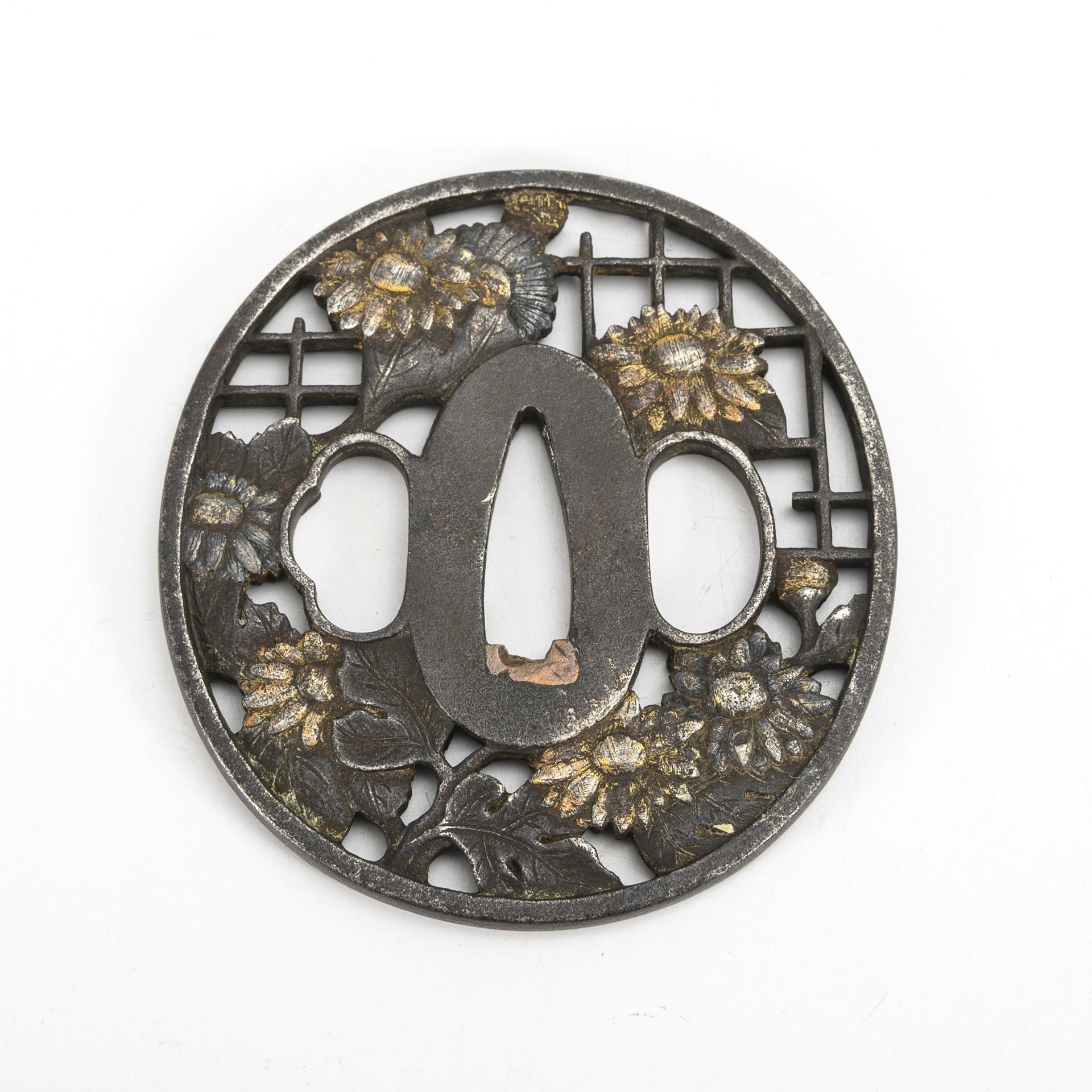 Sie befinden sich hier:   Startseite Kategorien Außereuropäische Kunst Tsuba mit Blüten auf Gitter