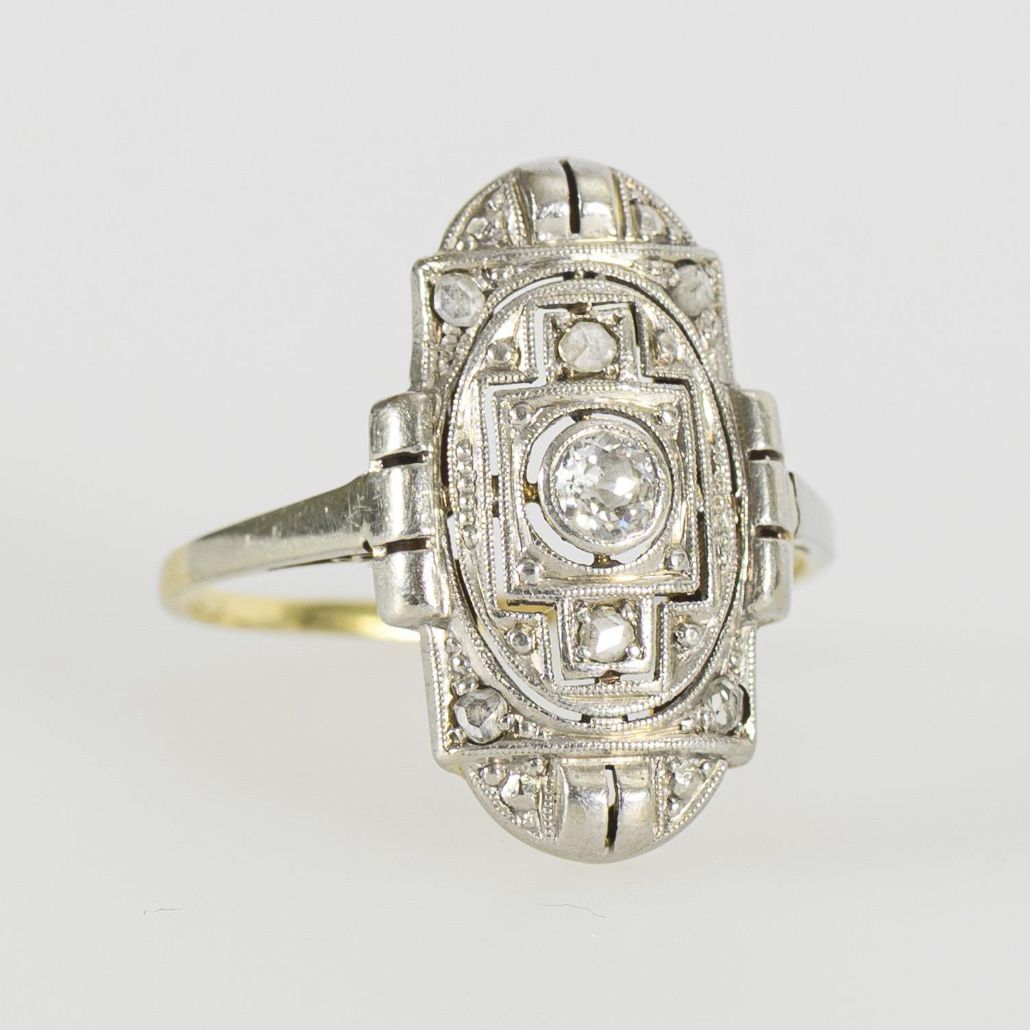 Zwischen einer zarten Schiene ein ovaler, geometrisch teils mit Millegriffes-Zier ausgestalteter Ringkopf mit kleinen Diamanten im Rosenschliff sowie einem zargengefassten Altschliff-Brillanten. Unterseitig Spuren einer Ringweitung.