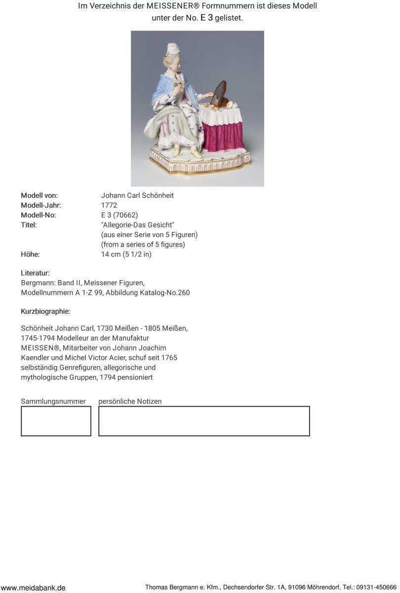Meissen-Manufaktur-Preis: 5490,- Euro. Schönheit, 1745-1794 Modelleur an der Manufaktur. Mitarbeiter von Kaendler und Acier. Arbeitete seit 1765 an eigenen Modellen * Partnerauktion Bergmann.