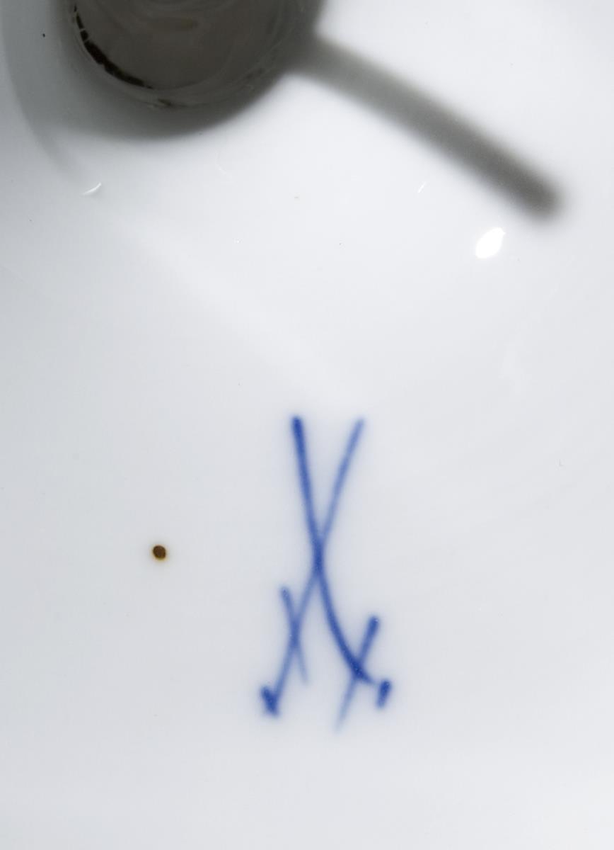 Allseits Purpur-Camaieumalerei mit Goldpunkten, Goldstaffage. Gärtnerkind farbig bemalt. Verschraubte 2-stufige Etagere mit plastischer Figurenbekrönung. Durchbrochen gearbeitete Schalen mit je drei reliefierten Rocaillen-Kartuschen. Reliefierter Balusterschaft. Ritzmarke, Pressmarke, Malermarke, Schwertermarke 1. Wahl.