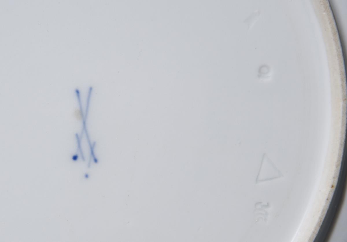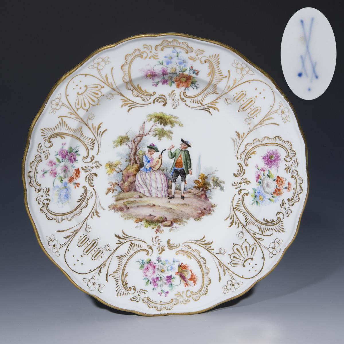 Dekor nach einem Meisen-Modell von 1745. Farbig bemalt, Golddekor "Dulong" mit Blumenbuketts in den Kartuschen. Im Spiegel "Galantes Paar in Parklandschaft" nach einer Vorlage von Jean Antoine Watteau. Unbekannte Pressmarken, Schwertermarke.