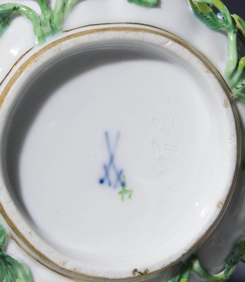 5-Teile: Tablett, Kaffeekanne, Teekanne, Milchkanne, Zuckerdose. Farbige Bemalung mit Einzelblüten und Insekten. Im Tablett-Fond Vergissmeinnichtblüten-Strauß, Goldstaffage. Allseits plastisch aufgelegte, naturalistisch bemalte Vergissmeinnicht-Blütenzweige. Ritzmarken, Schwertermarken 1. Wahl. Blüten, Blätter bestoßen (meist am Tablett). Im Tablett-Fond kleiner Chip. Wenige Blattspitzen restauriert.