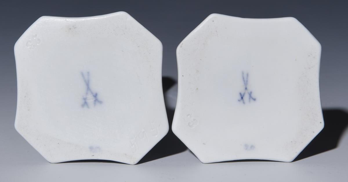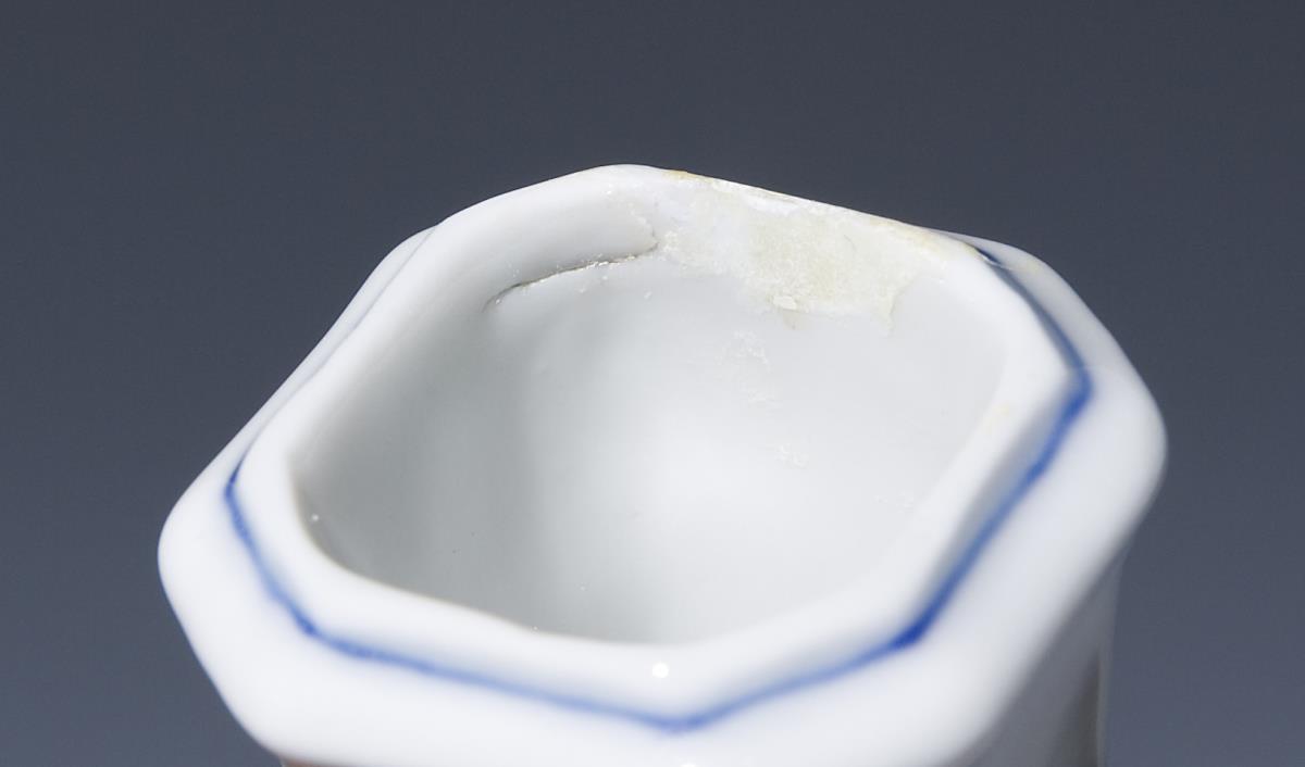 Umlaufend kobaltblaue Unterglasurmalerei, "Fels- und Vogeldekor". Unglasierter Boden. Ritzmarke, Pressmarken, Malermarken, Schwertermarken zweimal gestrichen. Ein Rand partiell restauriert.