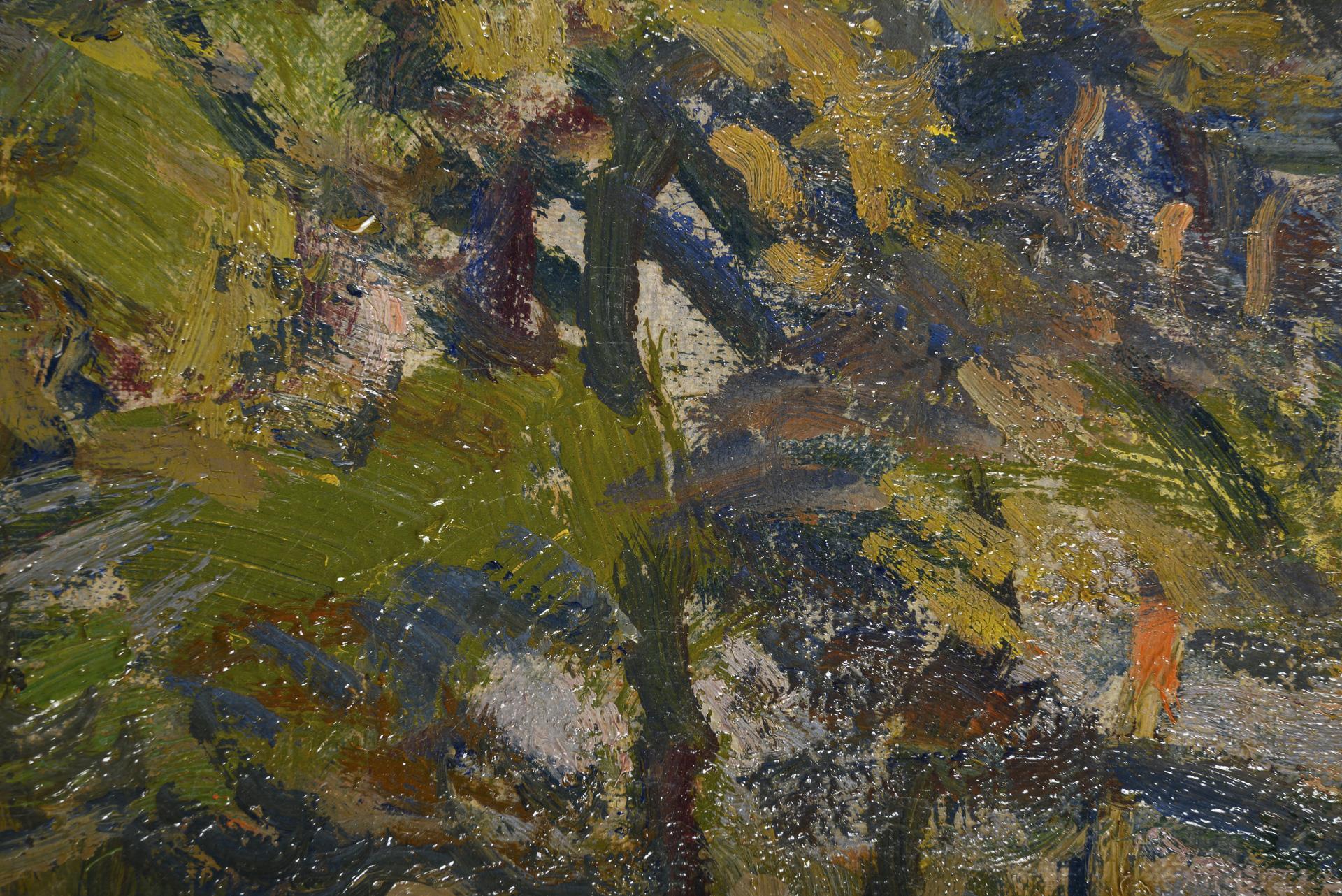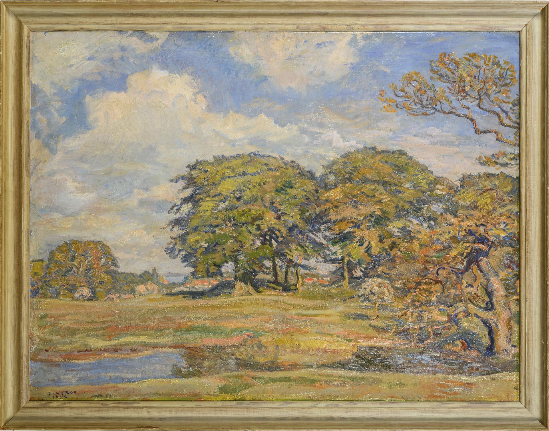 Dänische Landschaft mit Bäumen nahe einem Gewässer vor dem Ort. Nagellöcher oben links.
