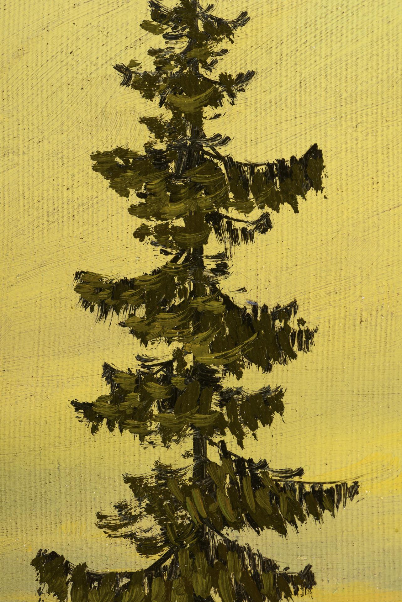 Verschneite Berghänge unterhalb der Wälder und dem leicht bewölkten Abendhimmel. Minimal Altersspuren.