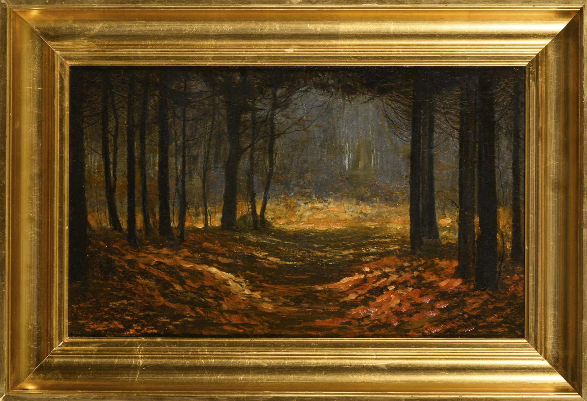 Dicht stehende schlanke Bäume zwischen herbstlich verfärbtem Laub auf dem Boden mit Blick zu einer Lichtung. Leichte Altersspuren.