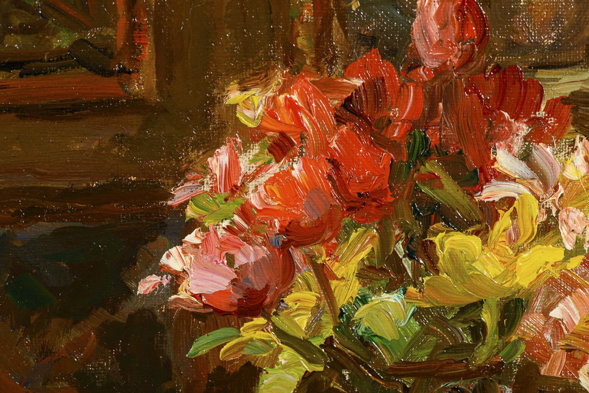 Bürgerliche Stube mit Blumenstrauß auf einer Kommode vor einer Wand mit Gemälden.