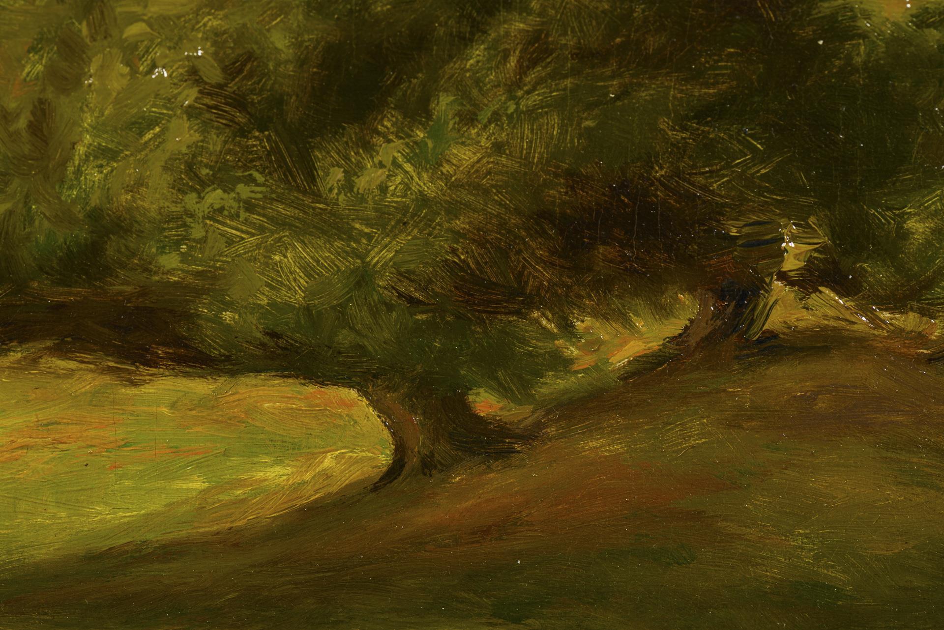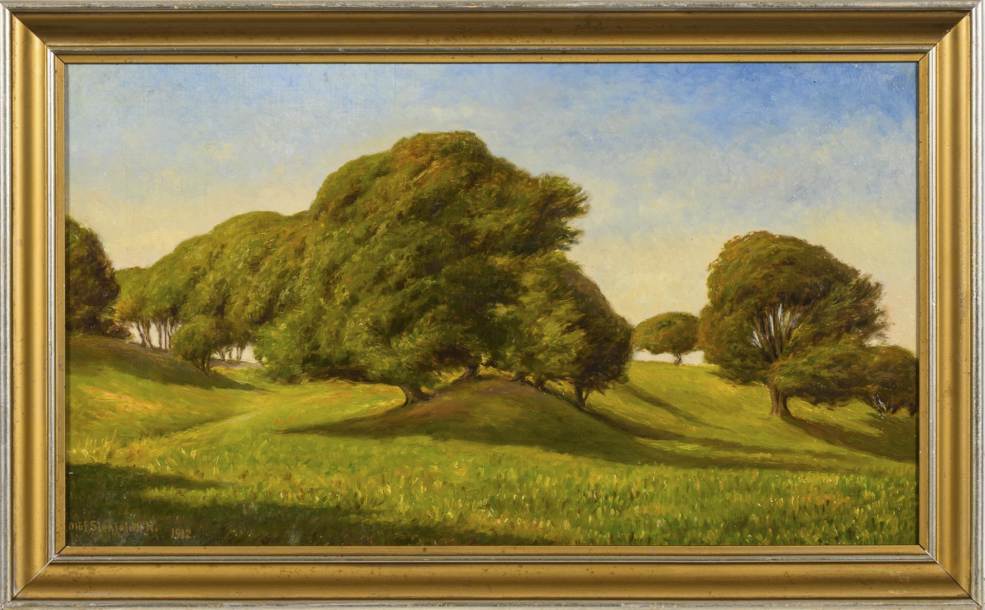 Hügelige Sommerlandschaft mit vereinzelten Bäumen unter blauem Himmel.