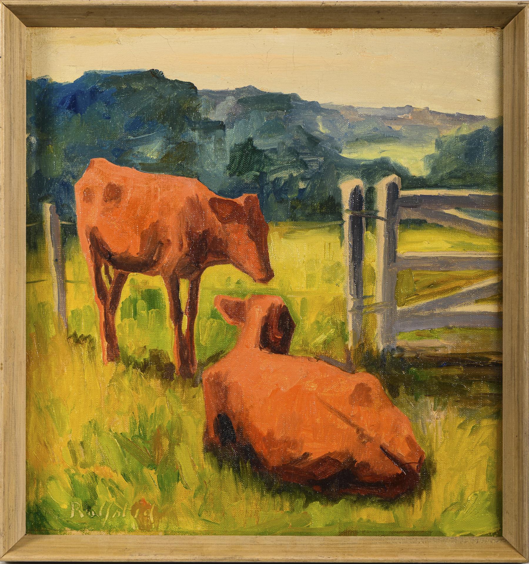 An Franz Marc erinnernde Darstellung zwei Kühe auf der grünen Wiese mit Blick in die weite Waldlandschaft.