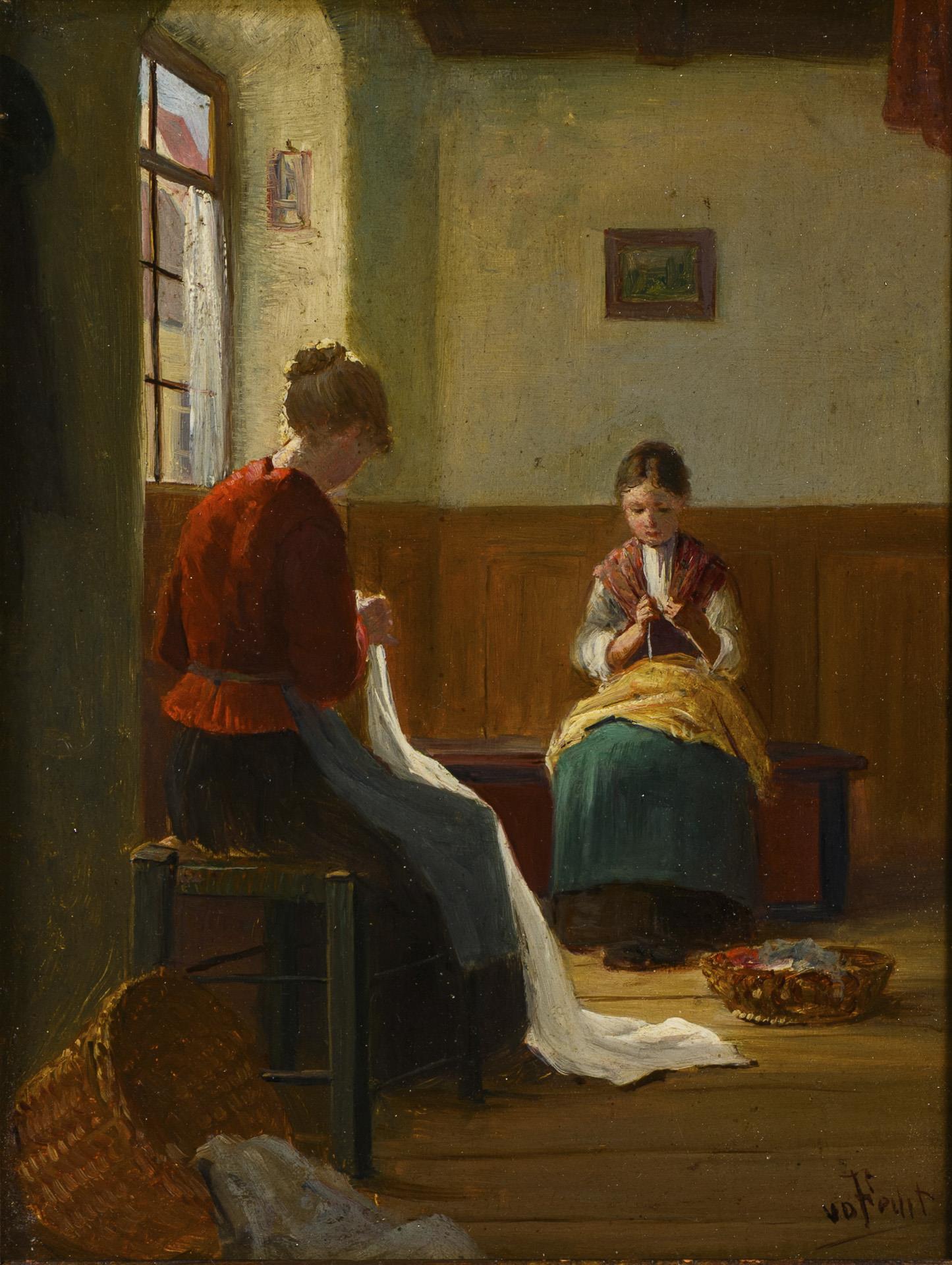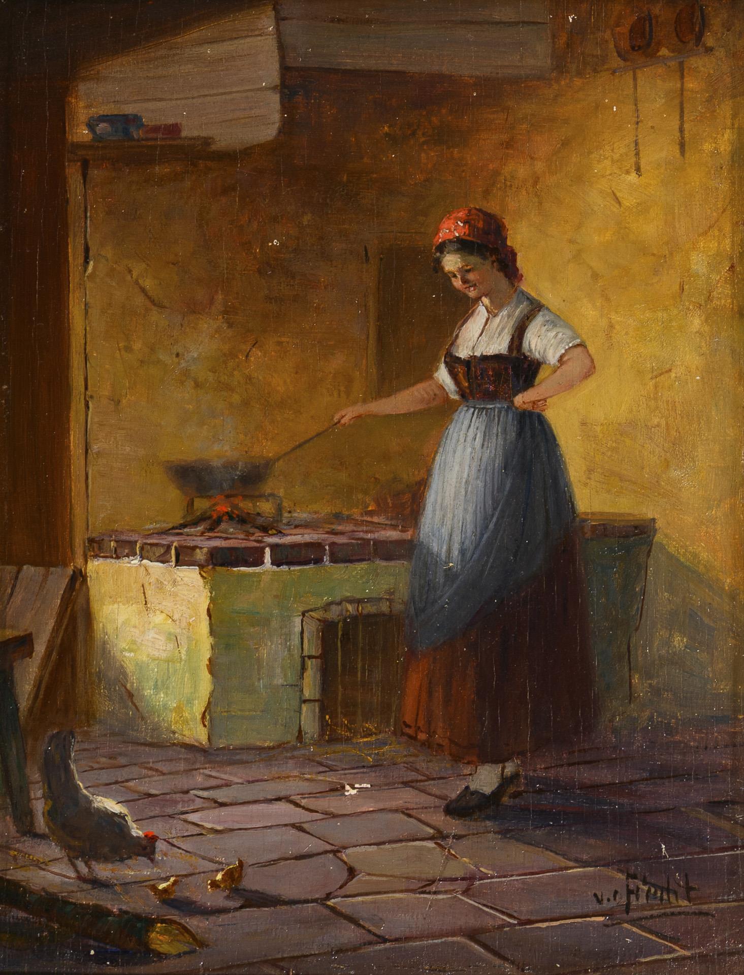 Junge Frau an der Feuerstelle in der Küche beim Kochen sowie zwei Frauen in der Stube beim Nähen. Leichte Altersspuren.