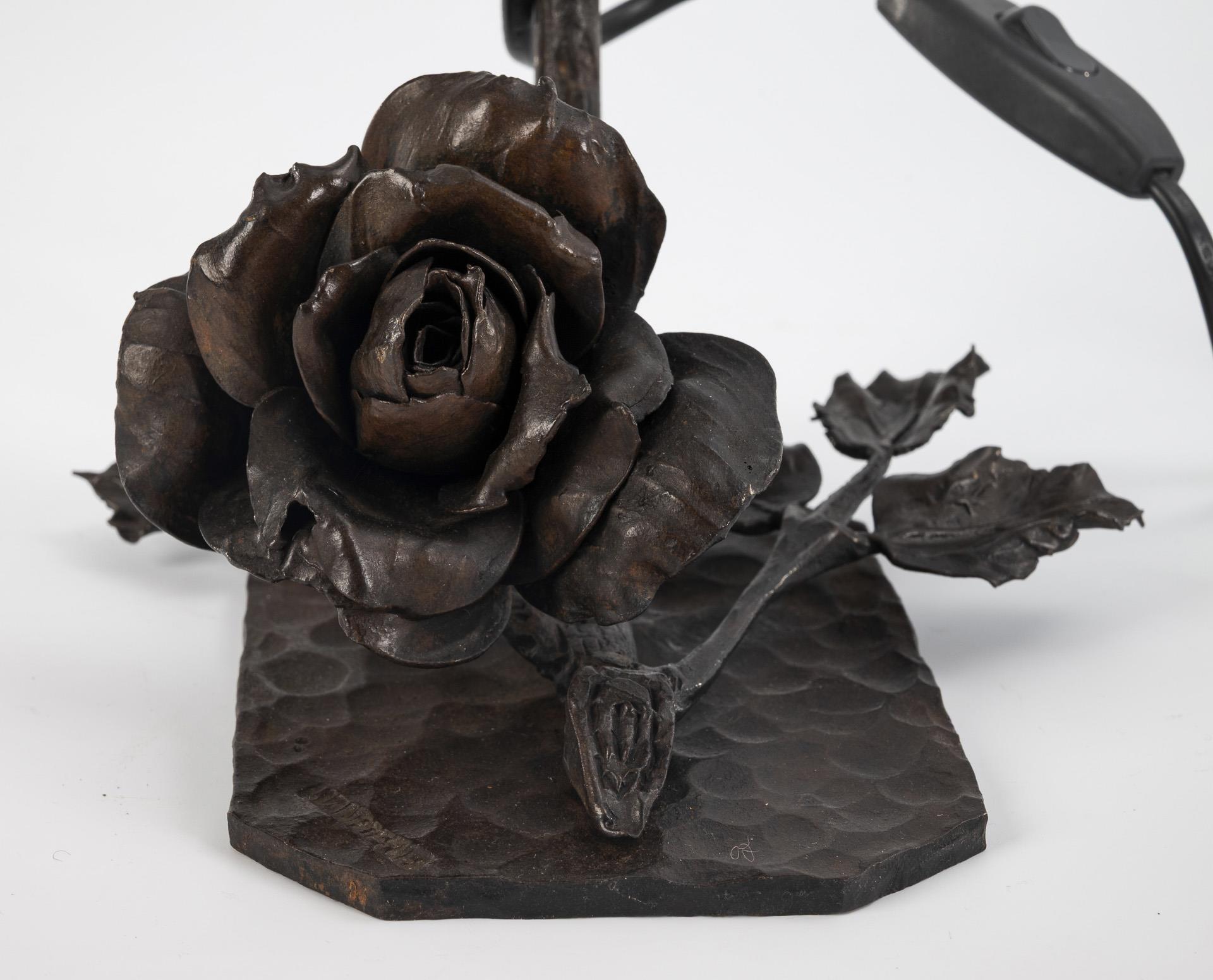 Geschmiedeter Rosenzweig mit großer Blüte an der martellierten Grundplatte, stängelartiger Schaft mit Blattbesatz sowie Kelchblättern am glockenförmigen Glasschirm mit dreifach gekniffenem Rand. Elektrifizierung erneuert. Funktioniert.