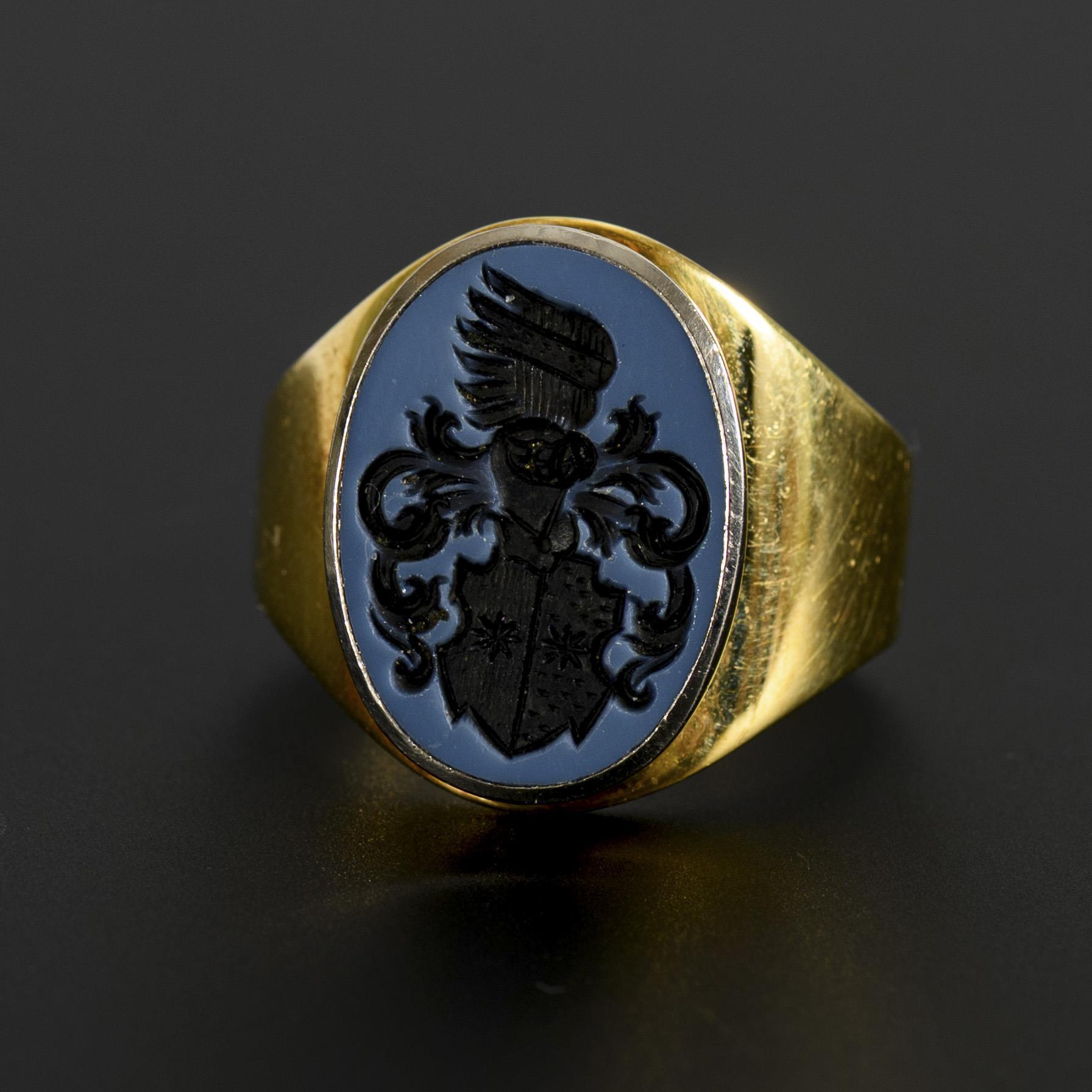 Siegelring mit Intaglio eines Wappens in einer ovalen Lagenonyx-Tafel, dieses geteilt einen Stern auf goldenem sowie einen Stern auf rotem Grund zeigend, darüber eine Helmdecke sowie ein mit Flug bekrönter Helm.