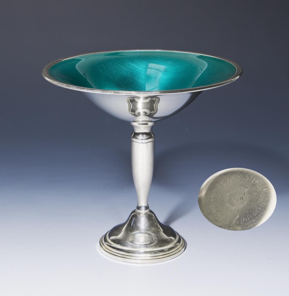 Sterlingsilber. Innen flaschengrünes Email. Schlichte glatte Form über Balusterschaft und gefülltem Rundfuß. Punzen mit Firmenstempel und Feingehalt.