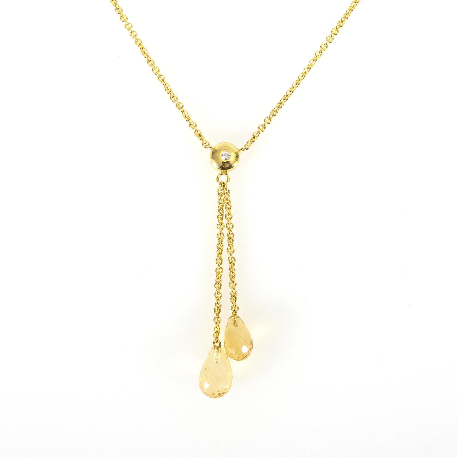 Zartes Collier mit einem kleinen, zargengefassten Brillanten und zwei Abhängungen leicht unterschiedlicher Länge mit facettierten Citrin-Pampeln. Die Kette mit Karabinerverschluss.