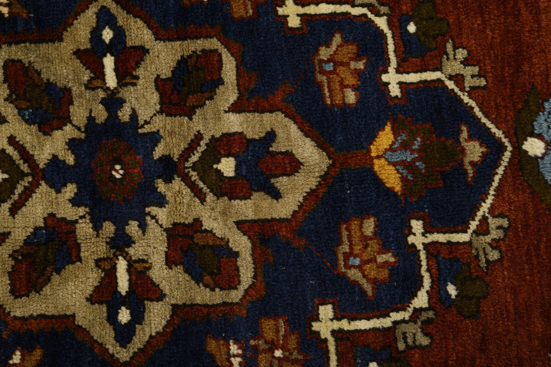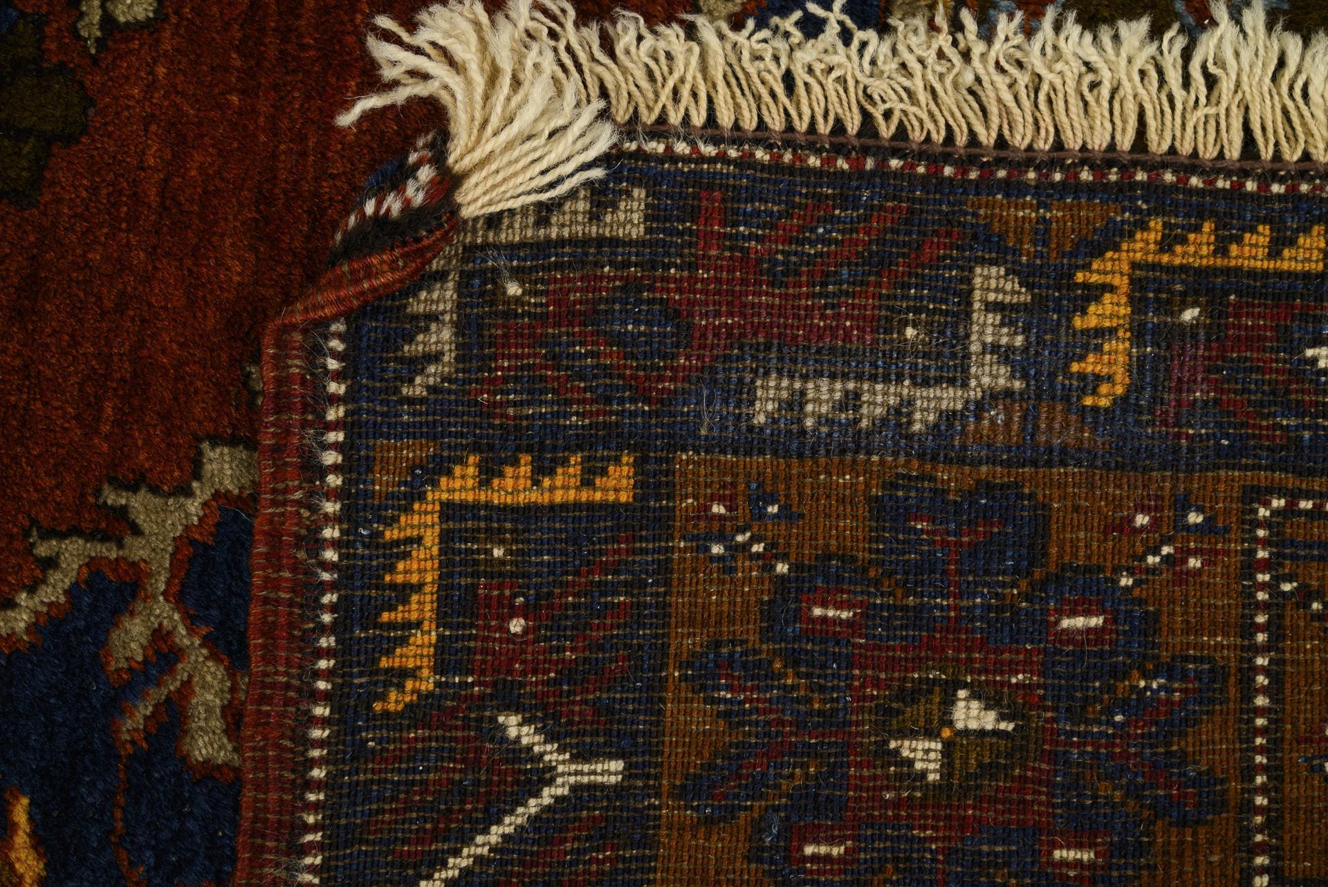Rautenförmiges Stufenpolygon mit Kreuzblütenmotiv, auf offenem, rotem Spiegel mit nachtblauen Zwickeln, an den Schmalseiten des Mittelfelds 2 Paneele mit hakenbesetzten Palmettenranken. Dreireihige Bordüre mit Herati-Dekor und Blütenwellenranken, kurze gedrehte Fransenabschlüsse. Minimale Alters- und Gebrauchsspuren.