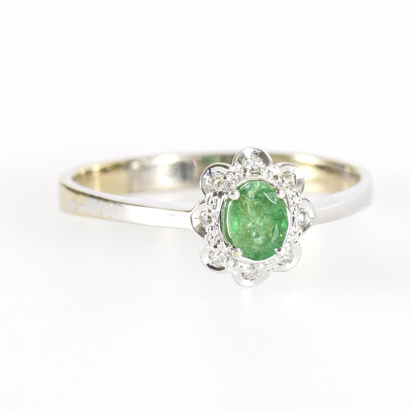 Sie befinden sich hier: Startseite Kategorien Schmuck Blütenförmiger Ring mit grünem Farbstein, wohl Smaragd, und kleinen Diamanten