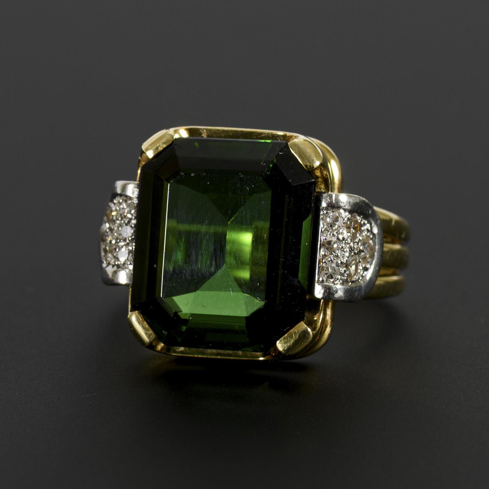 Ring mit einem krappengefassten grünen Farbstein im Smaragdschliff, zwischen mit je 6 pavégefassten Achtkant-Diamanten besetzten Ringschultern in Weißgold, auf einer breiten, dreibändrigen Schiene. Unterseitig mit leichten Tragespuren.