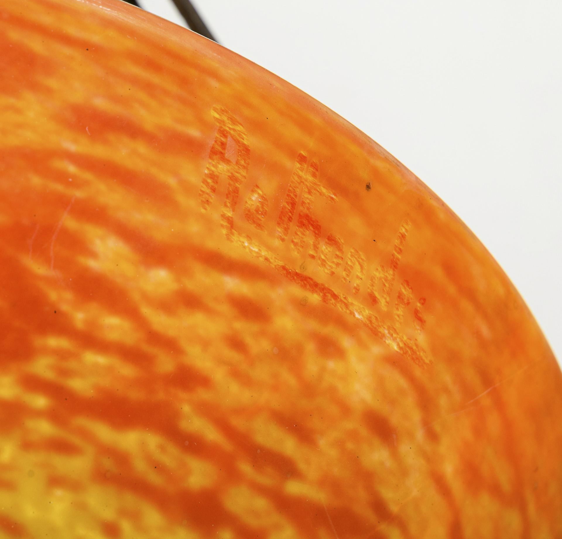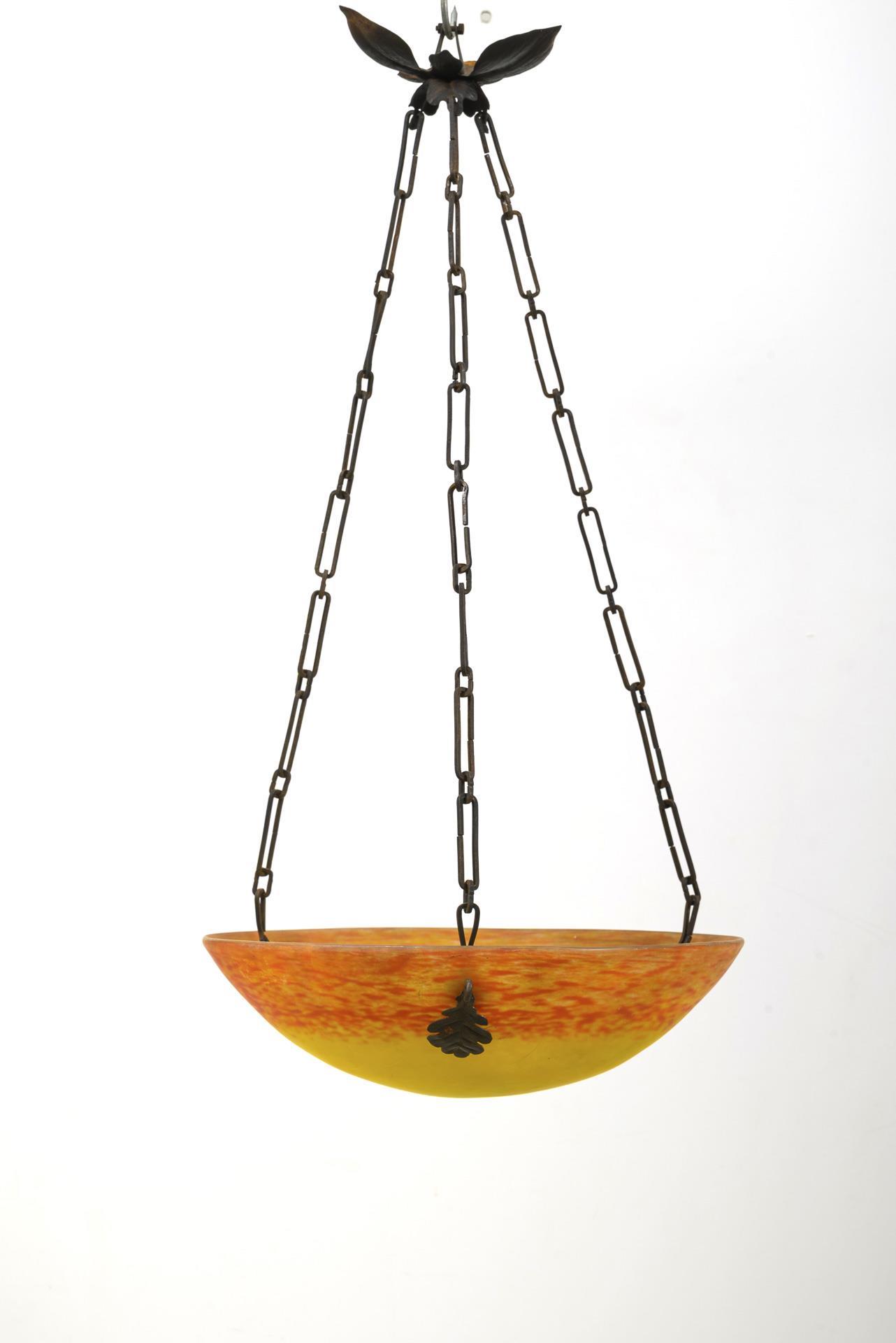 Deckenlampe mit Blattbaldachin und drei schmiedeeisernen Kettenaufhängungen. Die Schale aus farblosem, mattiertem Glas weist Pulvereinschmelzungen in rot, gelb und orange auf und ist an Laubansätzen befestigt.