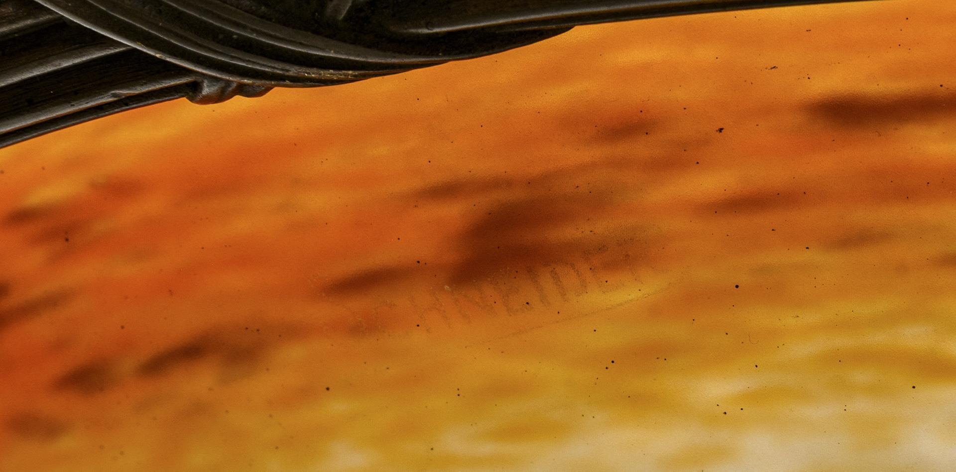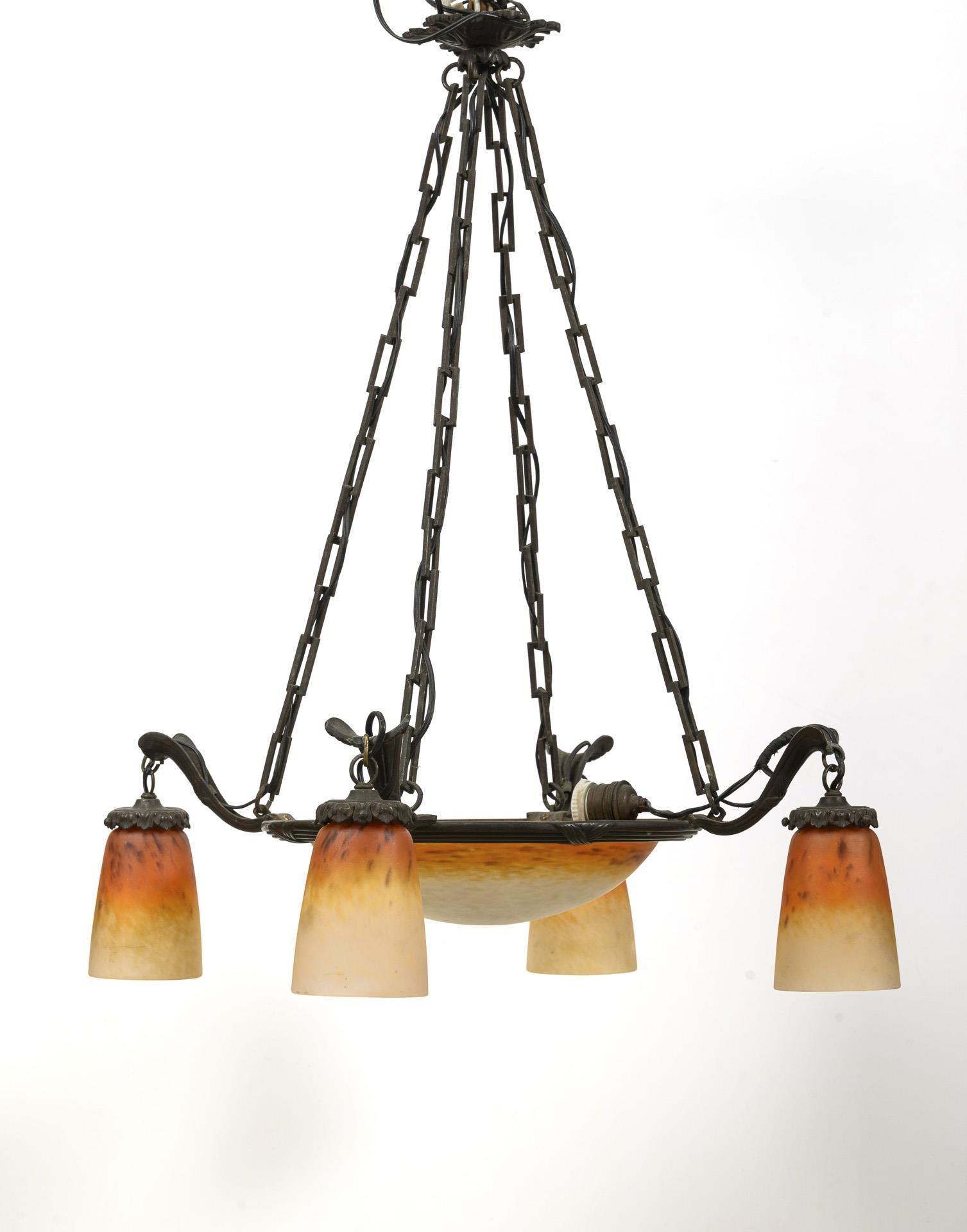 5-flammige Hängelampe an einem ornamentierten Baldachin mit vierstrebigem Gliederkettengehänge. Eine 1-flammige Mittelschale aus farblosem, mattiertem Glas mit Pulvereinschmelzungen in weiß, gelb und orange, partiell überlagert von Pulvereinschmelzungen in lila, wird von vier Leuchterarmen ergänzt, die Glockenschirme aus demselben Glas tragen. Funktion nicht geprüft.