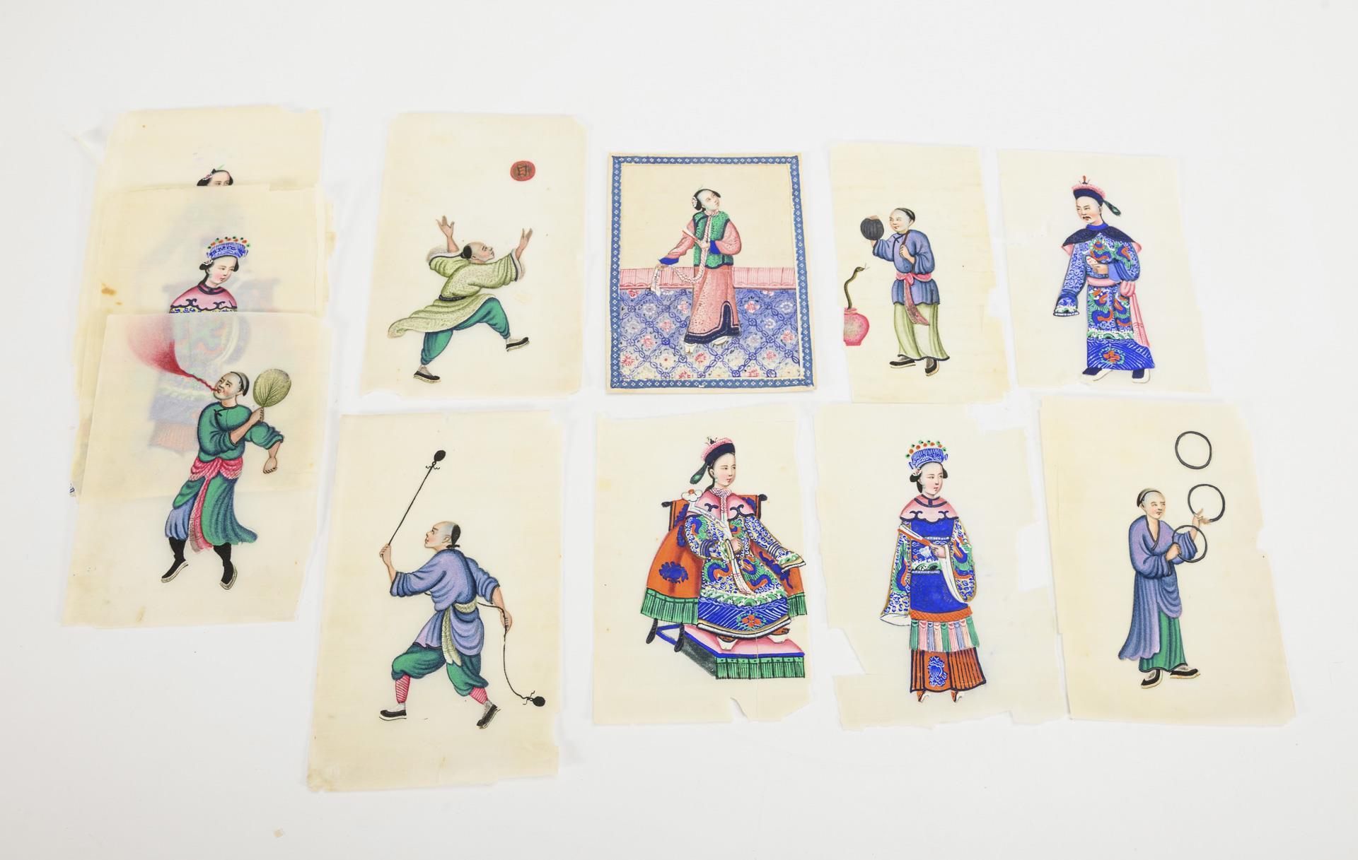16 Blätter mit Abbildungen von Beamten, Gauklern und Standespersonen. Zwei Blätter mit Stoffrand eingefasst, die anderen Blätter unterschiedlich stark eingerissen, davon sind bei sechs Bildern auch die Darstellungen betroffen. In alter Schatulle mit Glasplatte.