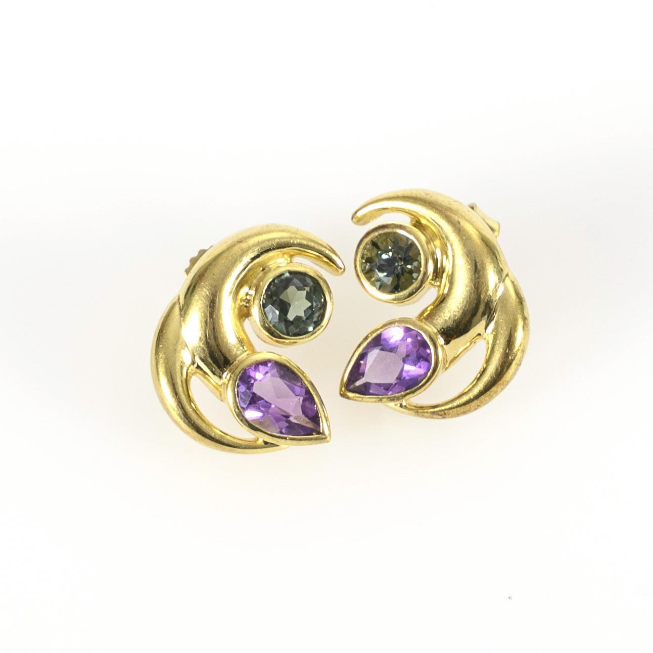 Schwungvoll gestaltetes Ohrsteckerpaar mit je einem tropfenförmigen Amethysten sowie einem rundfacettierten grünen Farbstein, in Zargenfassung.