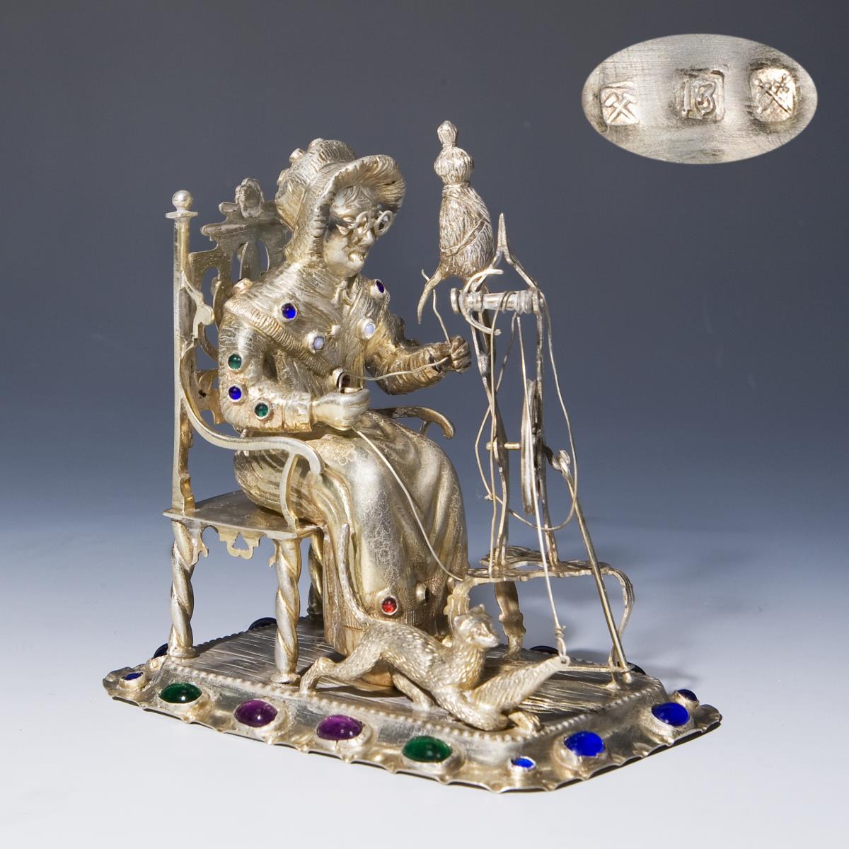 Gegossen, reliefiert, graviert. Allseits farbiger Glas-Cabochonbesatz in Smaragdgrün, Rubinrot und Saphirblau. Fein und detailreich gearbeitete vollplastische Figurengruppe. Phantasiemarken mit Feingehalt.