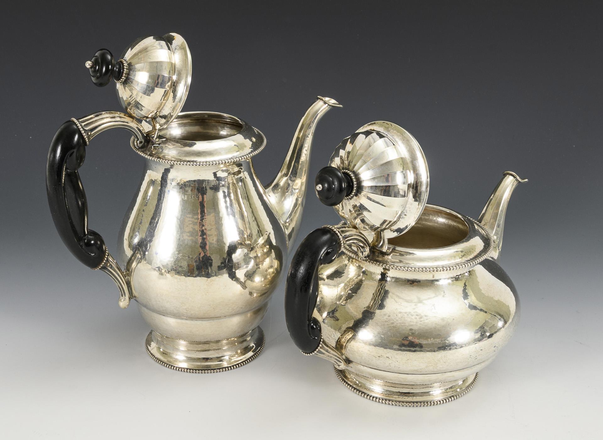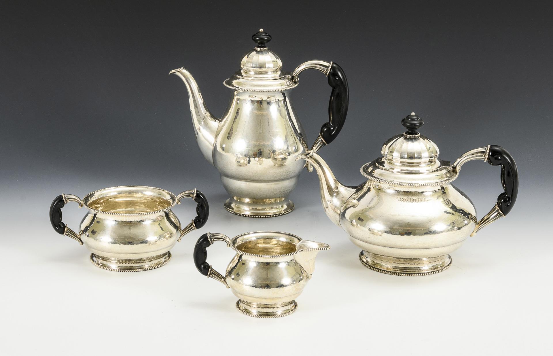 Elegantes Art-déco-Set mit Perlrand und ebonisierten Holzgriffen. Kaffeekanne, Teekanne Zuckerschale und Milchkännchen. Gebrauchsspuren, Teekanne mit innseitiger Lötstelle, Zuckerschale mit 1 gelockerten Henkel.