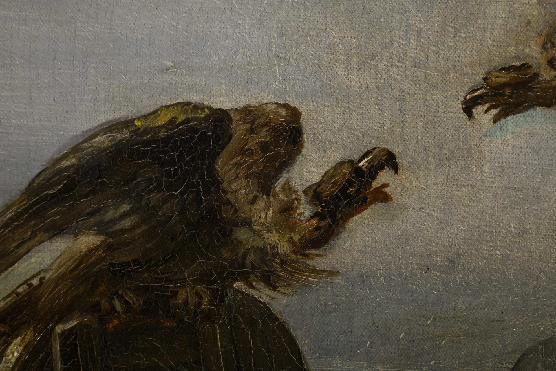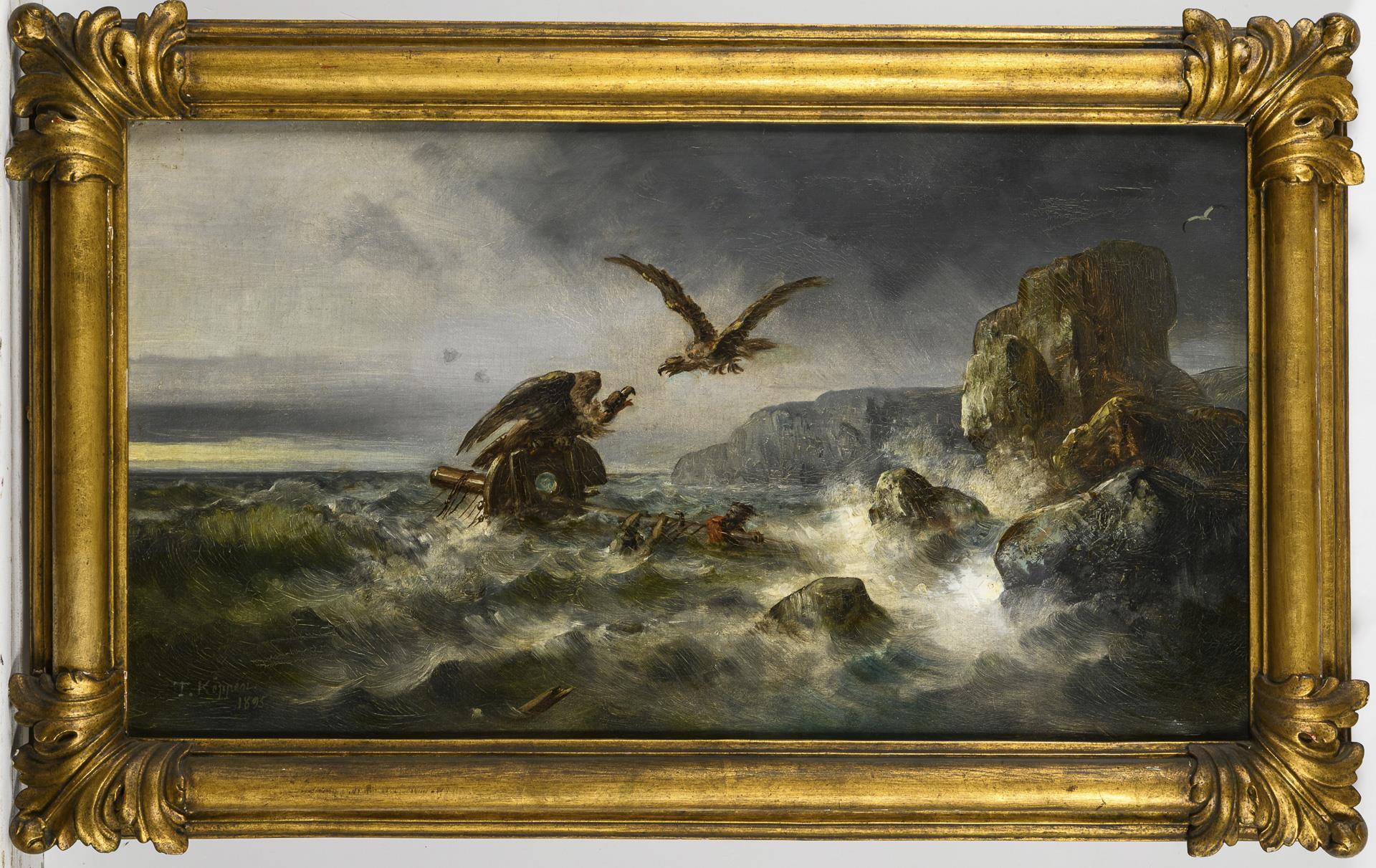 Die Vögel im Streit an einem gebrochenen Schiffsmast nahe der felsigen Küste, an welchem noch zwei Schiffbrüchige ums Überleben kämpfen. Altersspuren.