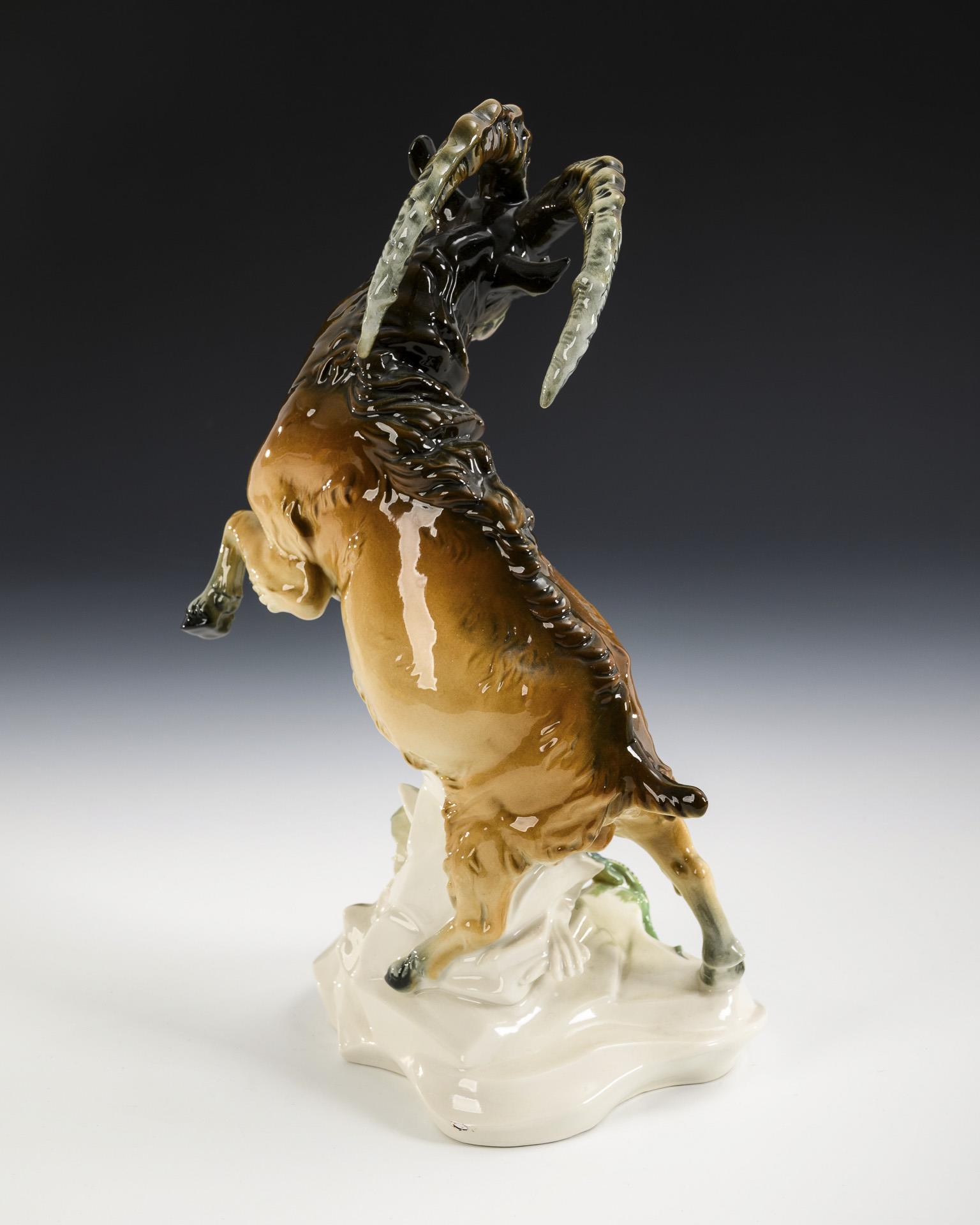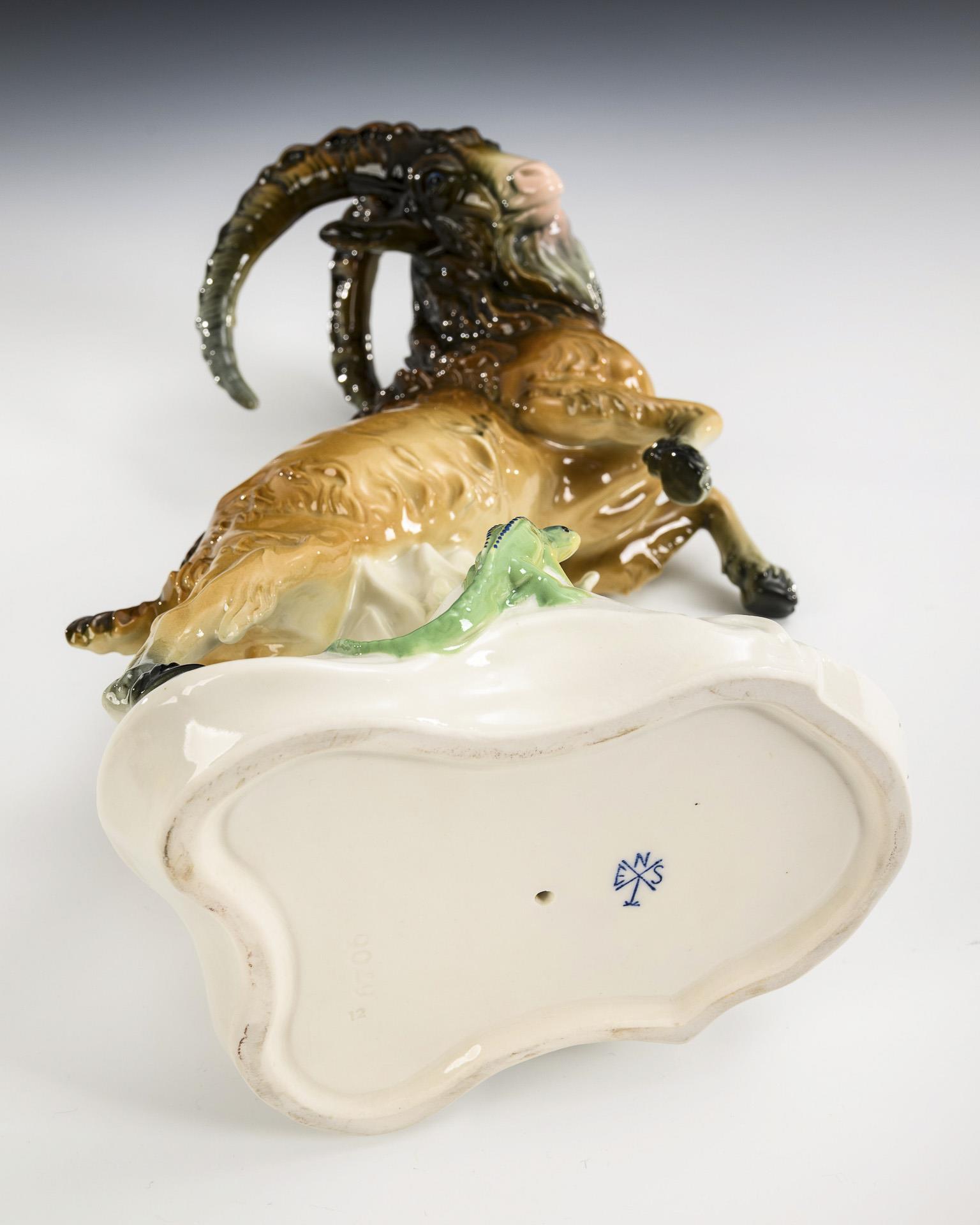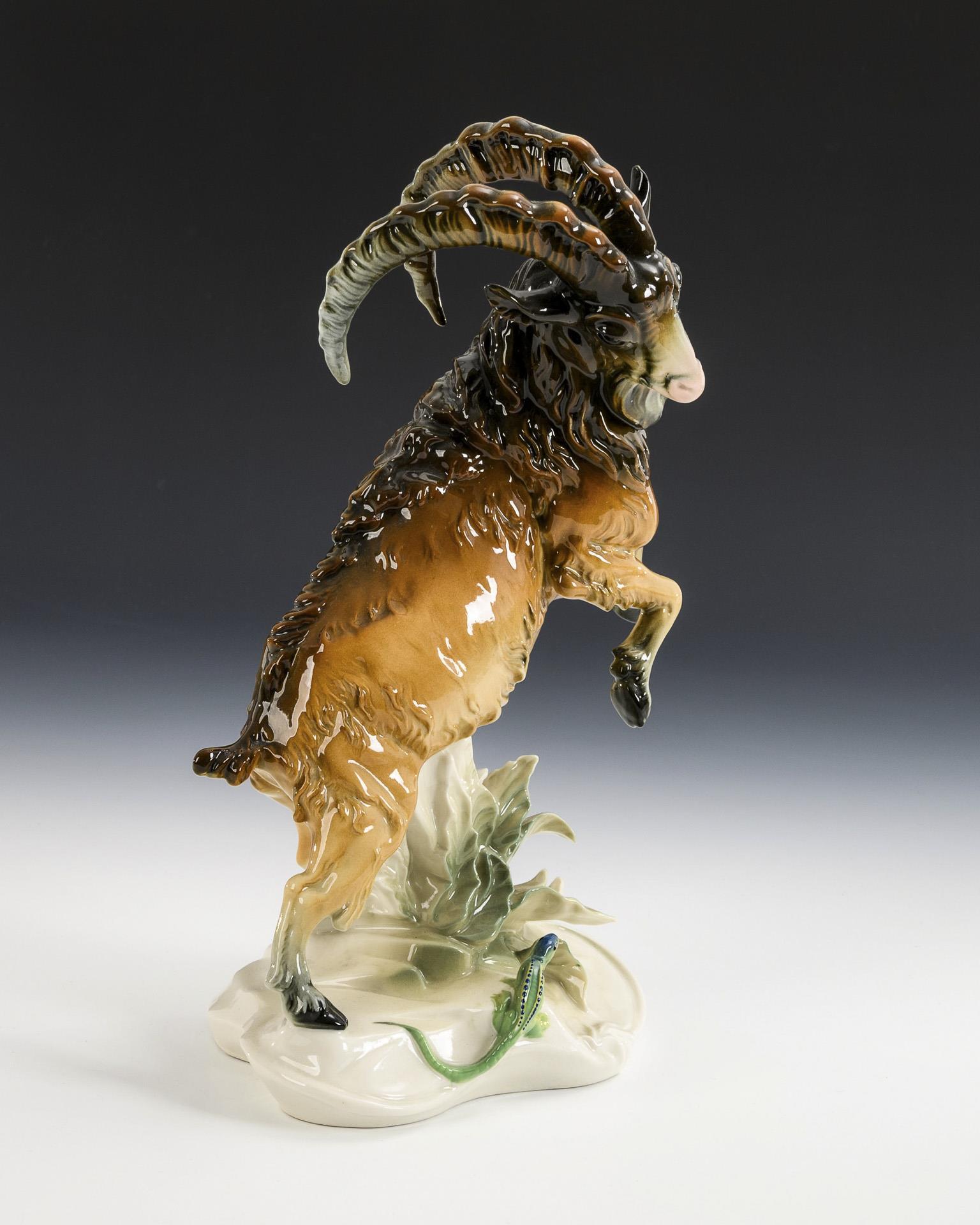 Über eine Blattpflanze springender, auf eine Eidechse schauender Steinbock.