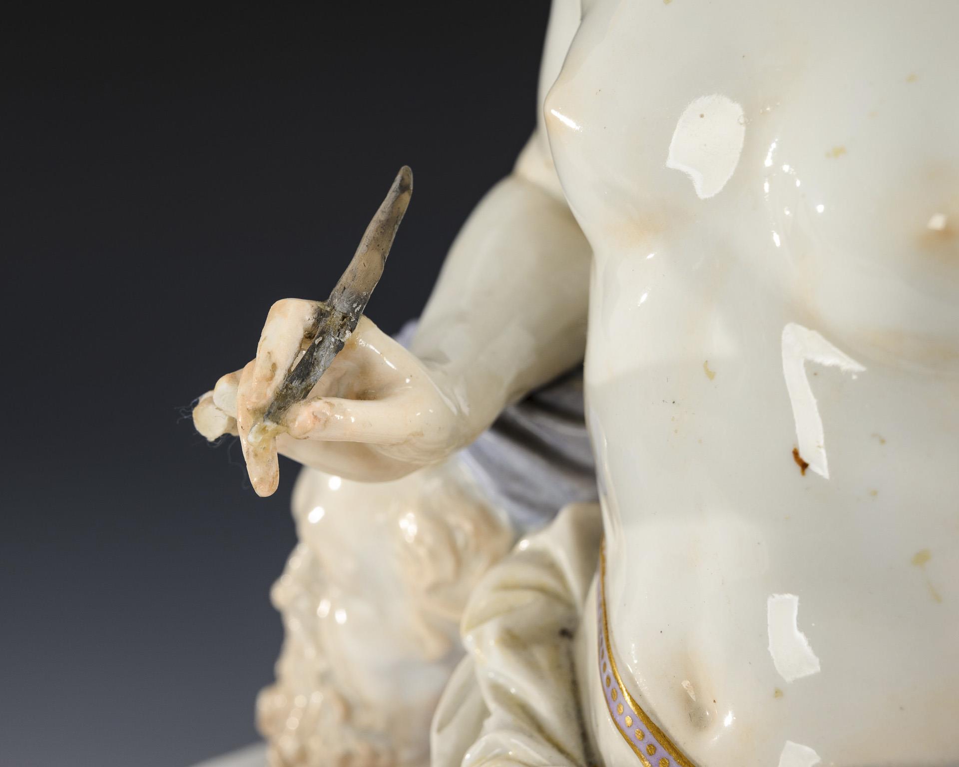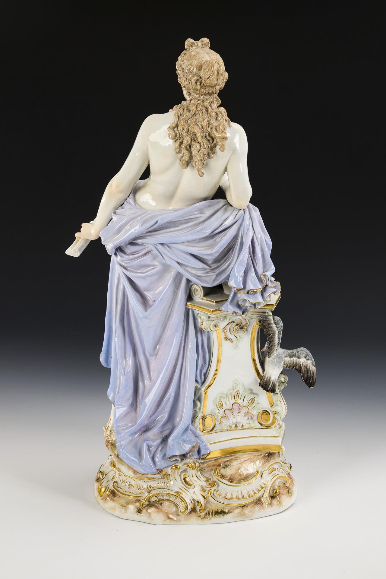 An einem Postament mit Büste und Skizzenrolle stehende junge Frau mit nacktem Oberkörper, einen Stift und eine Schriftrolle in den Händen haltend, zu ihren Füßen, eine Lyra, eine Palette und zwei Tauben. 2 Finger abgebrochen (davon 1 Finger lose anbei), Pinselenden bestoßen, Stift restauriert, einige Blätter bestoßen, 1 Taubenflügel bestoßen.