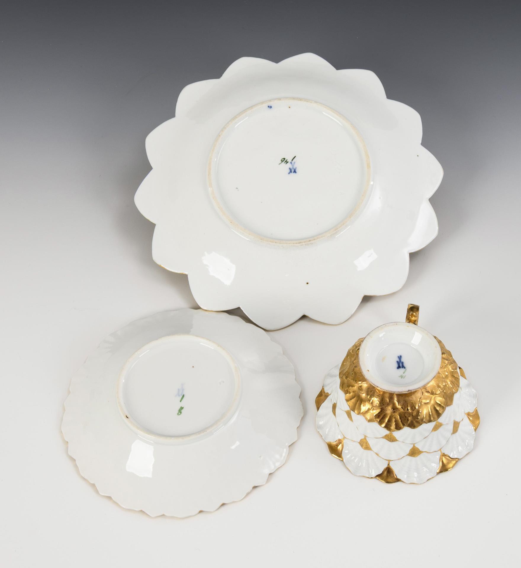 1x Tasse (H 7 cm) und Untertasse (Ø 15,5 cm) mit Muschelrelief. / 1x Teller mit teils goldbronziertem Blattrelief (Ø 22 cm). Tassenhenkel geklebt.