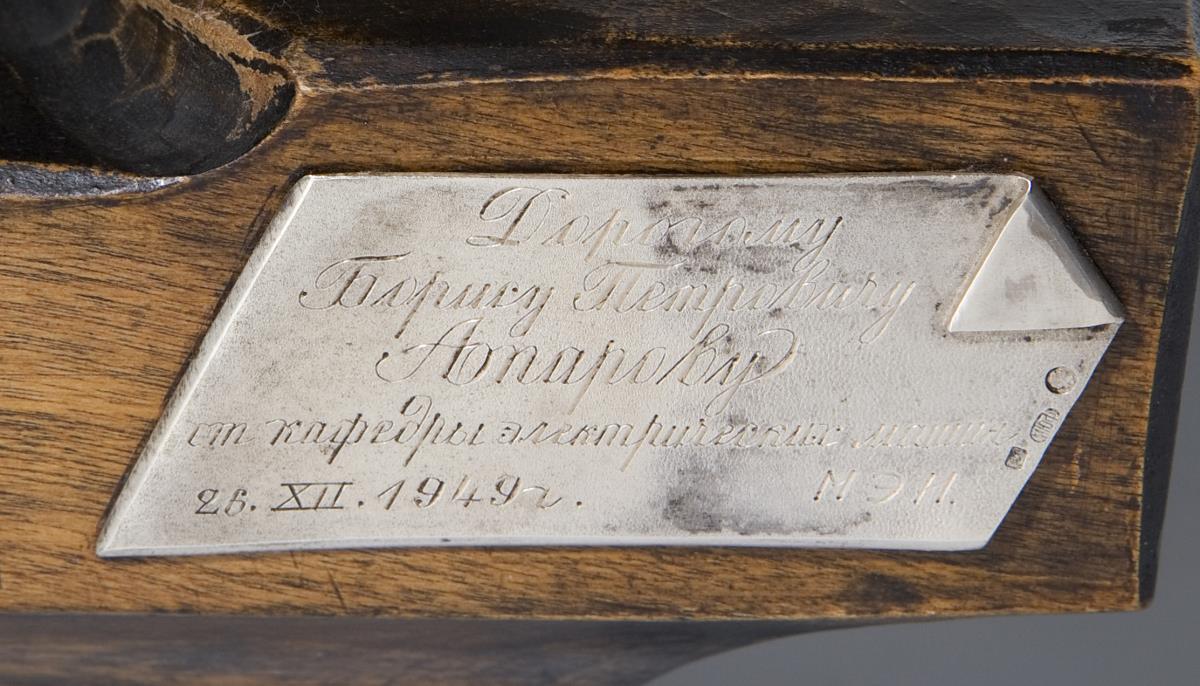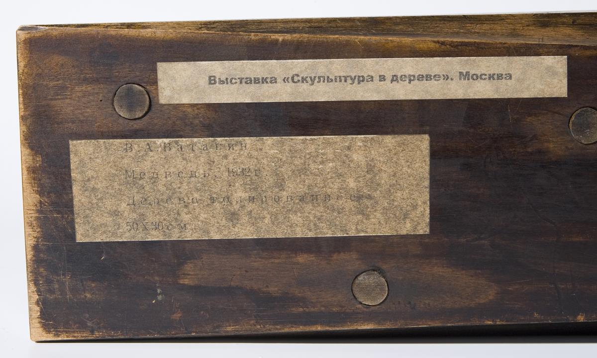 Vollplastisch geschnitzt. Naturalistisch modelliert. Im Boden Klebezettel mit kyrillischer Beschriftung, 1932 bezeichnet. Fels-Sockel mit applizierter Silber-Plakette mit gravierten kyrillischen Schriftzügen, 1949 datiert, seitlich drei Punzen.