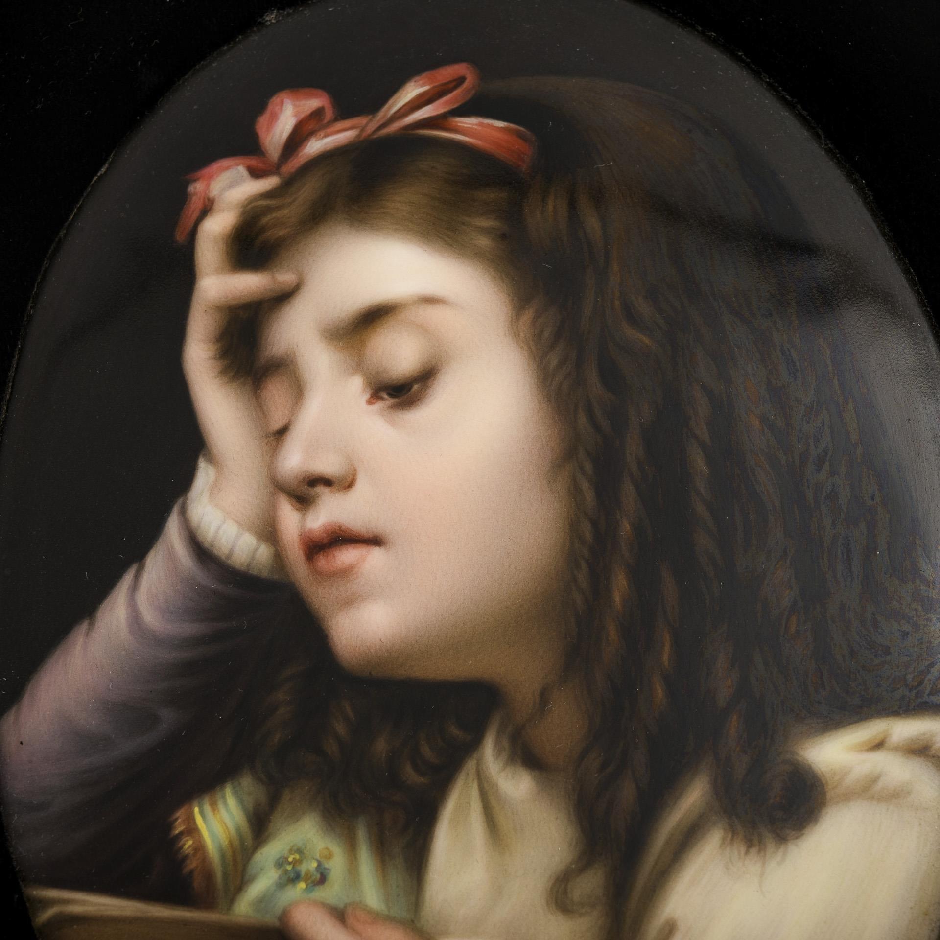 Ovale Platte mit der Darstellung eines Mädchens mit Buch, den Kopf auf die rechte Hand stützend, schwarzes Samtpassepartout.
