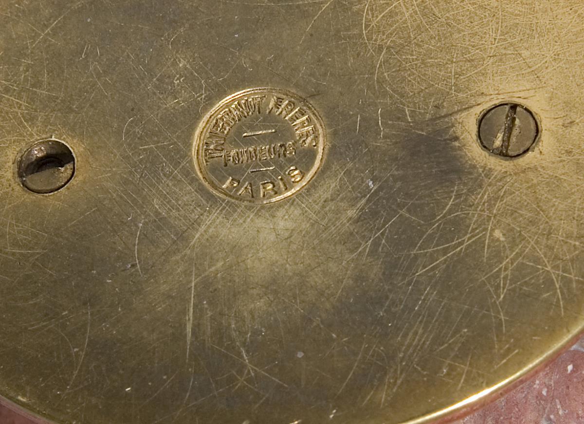 Montierte Bodenplatte mit Gießerstempel: Thiebaut Fréres Fondeurs Paris. Vase mit vergoldetem Ritz-Signet: P. Aubé. Eine Bruchlinie an der Mündung restauriert.