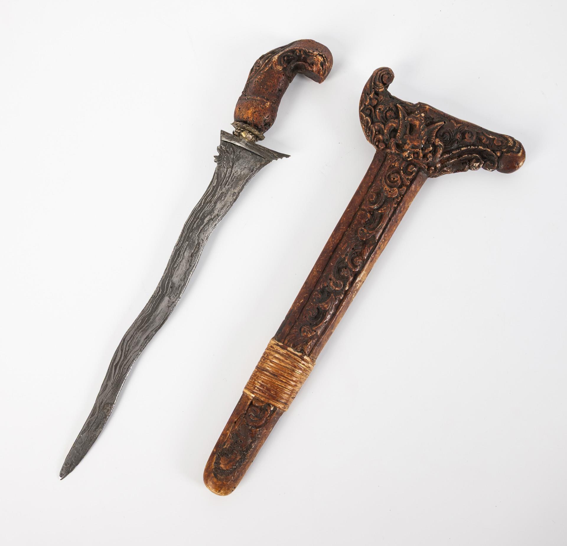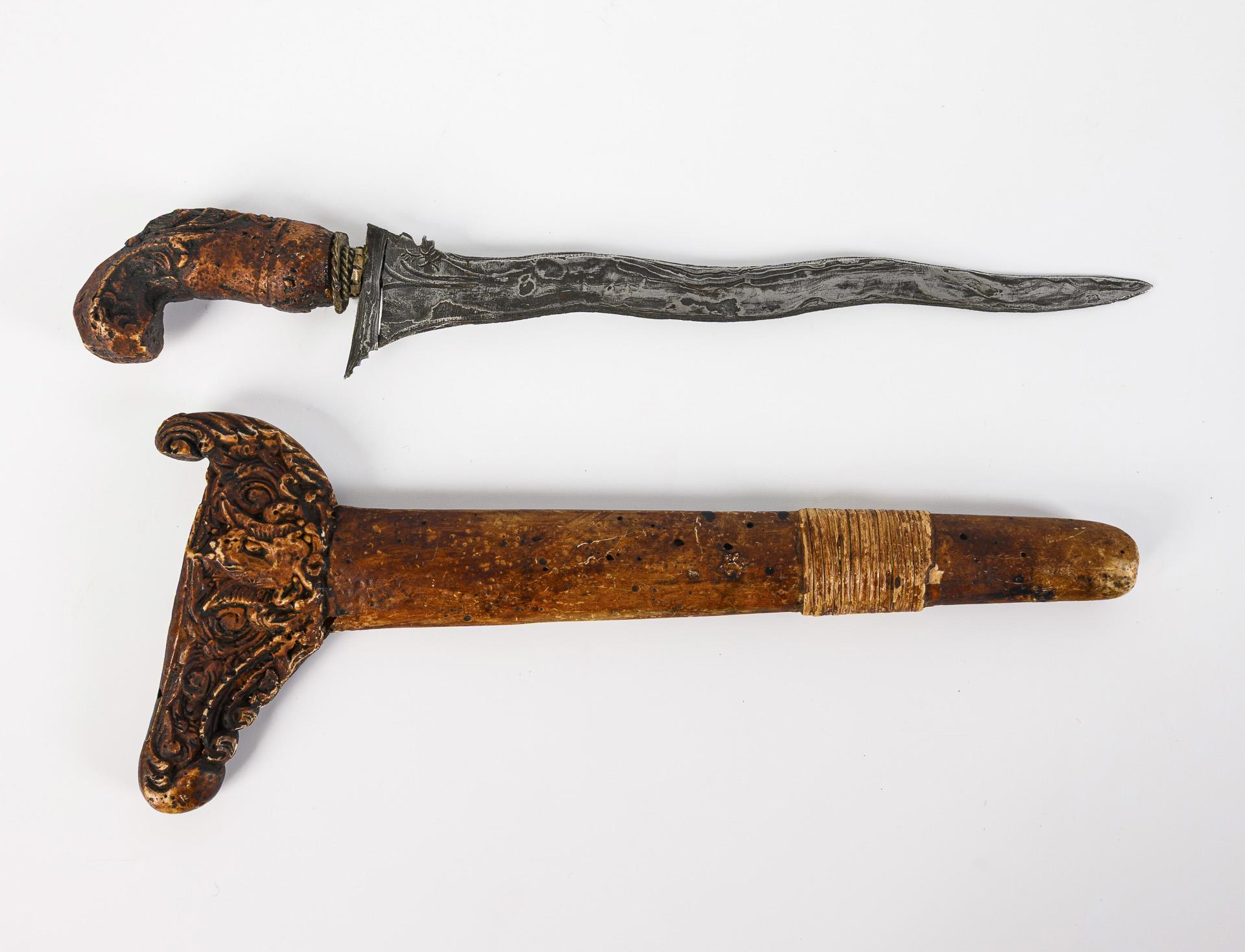 Wohl für Kinder. Gewellte Klinge mit schön ausgebildetem Pamor. Griff und Scheide aus rötlich gefärbtem Knochen (?). Dies ist sehr ungewöhnlich. Bastwicklung im unteren Bereich.