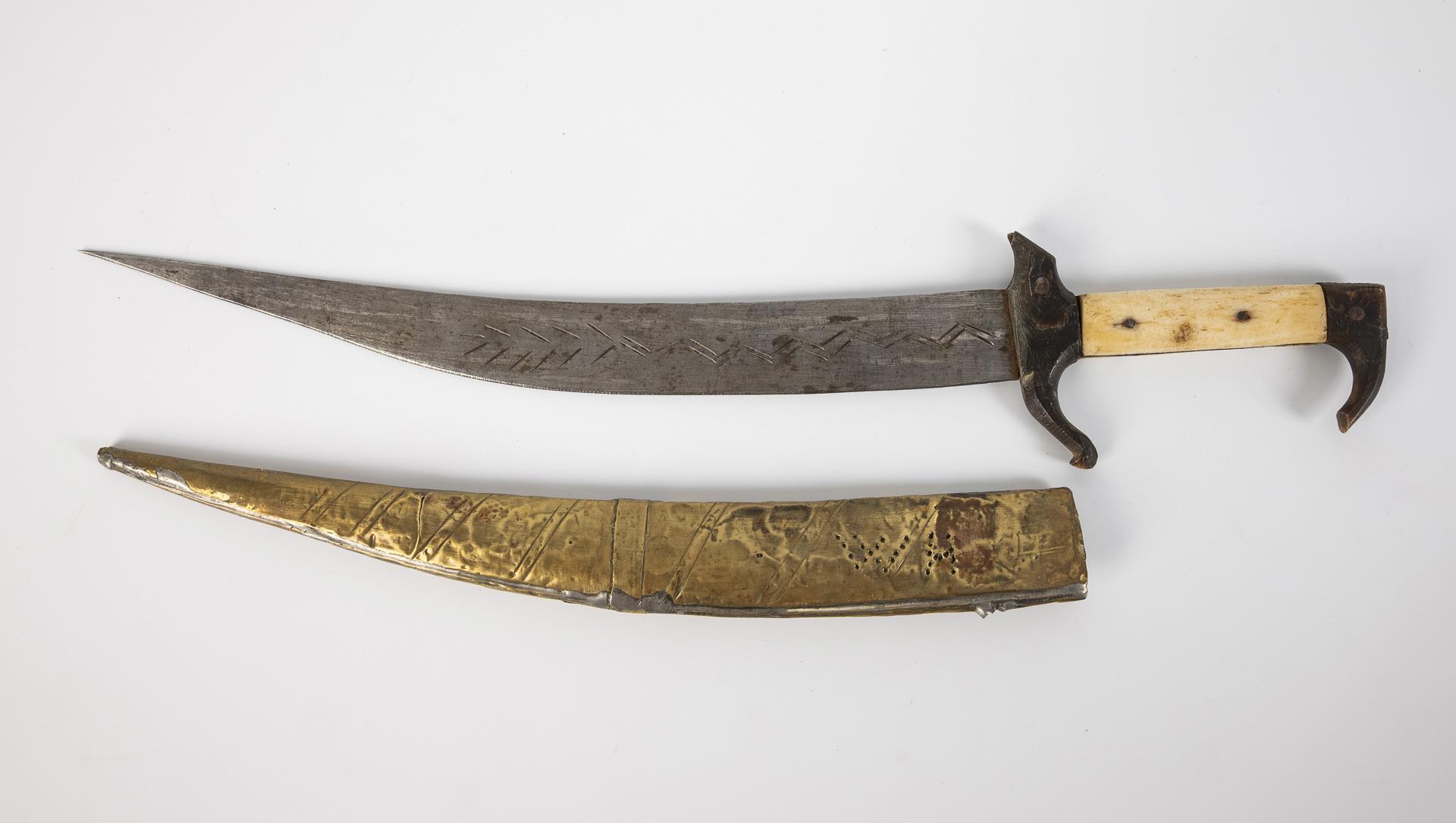 Gebogene, einschneidige Klinge mit arabischem Schriftzug. Scheide mit ornamentiertem Messingblech. Alters- und Gebrauchsspuren.