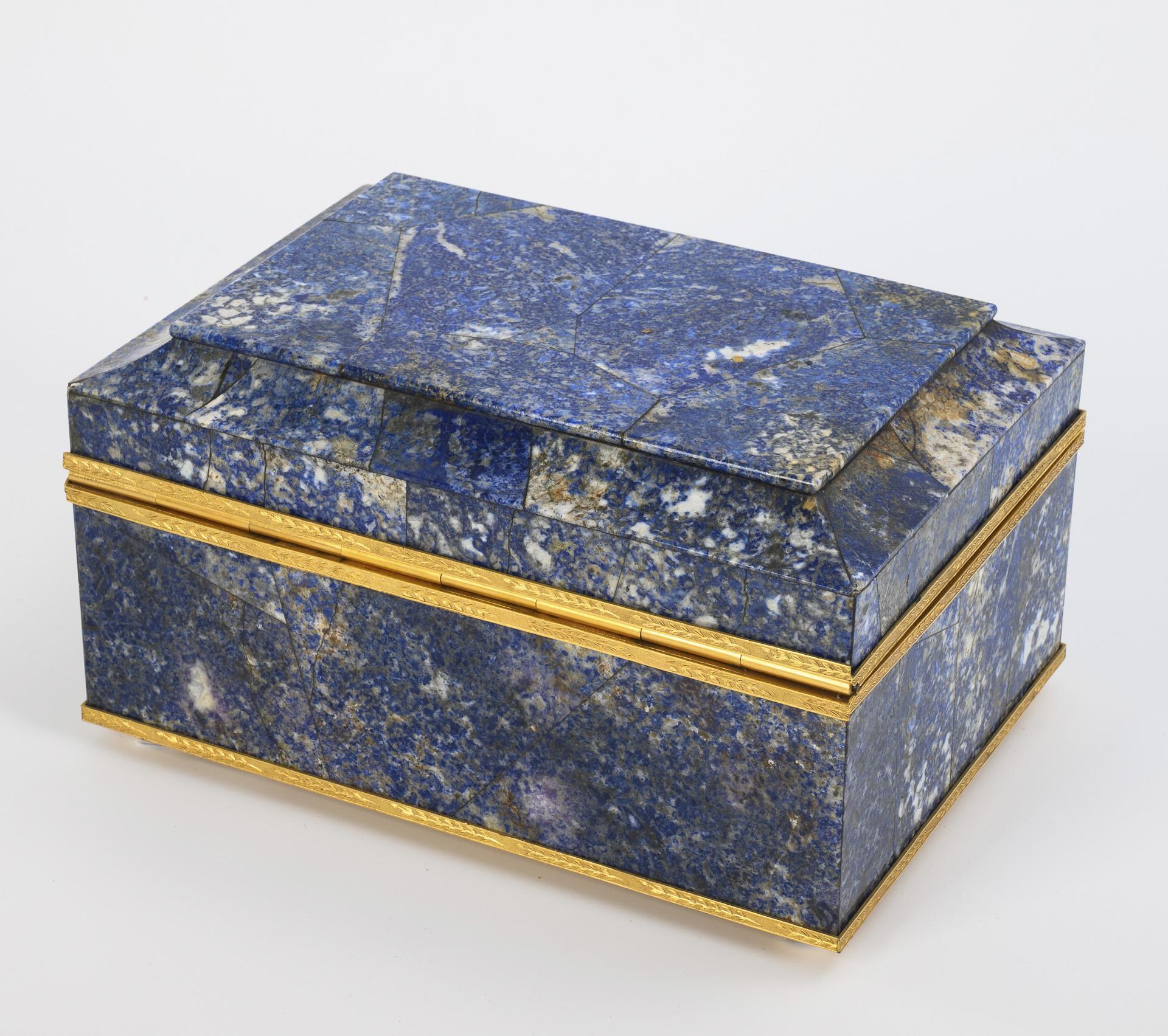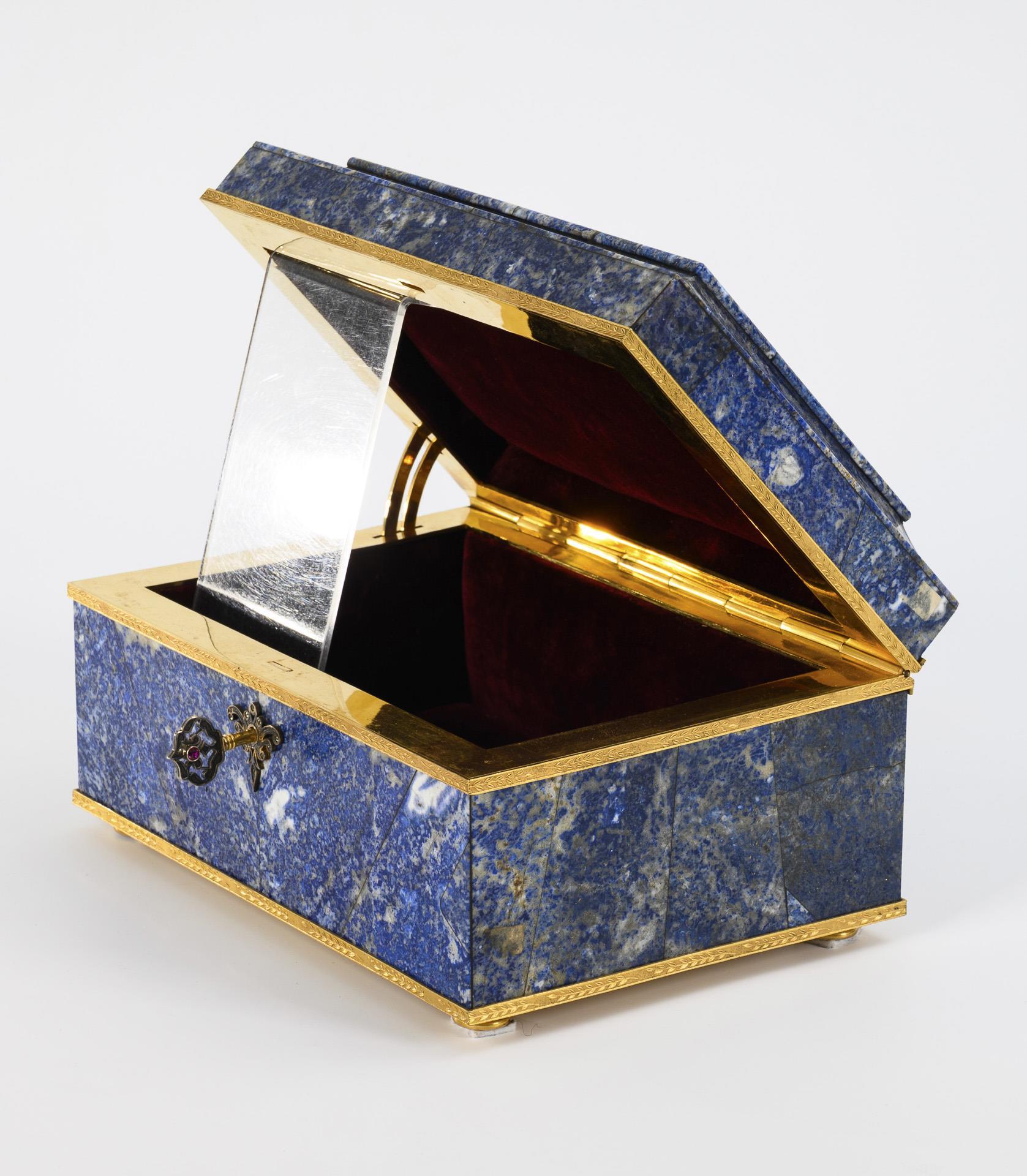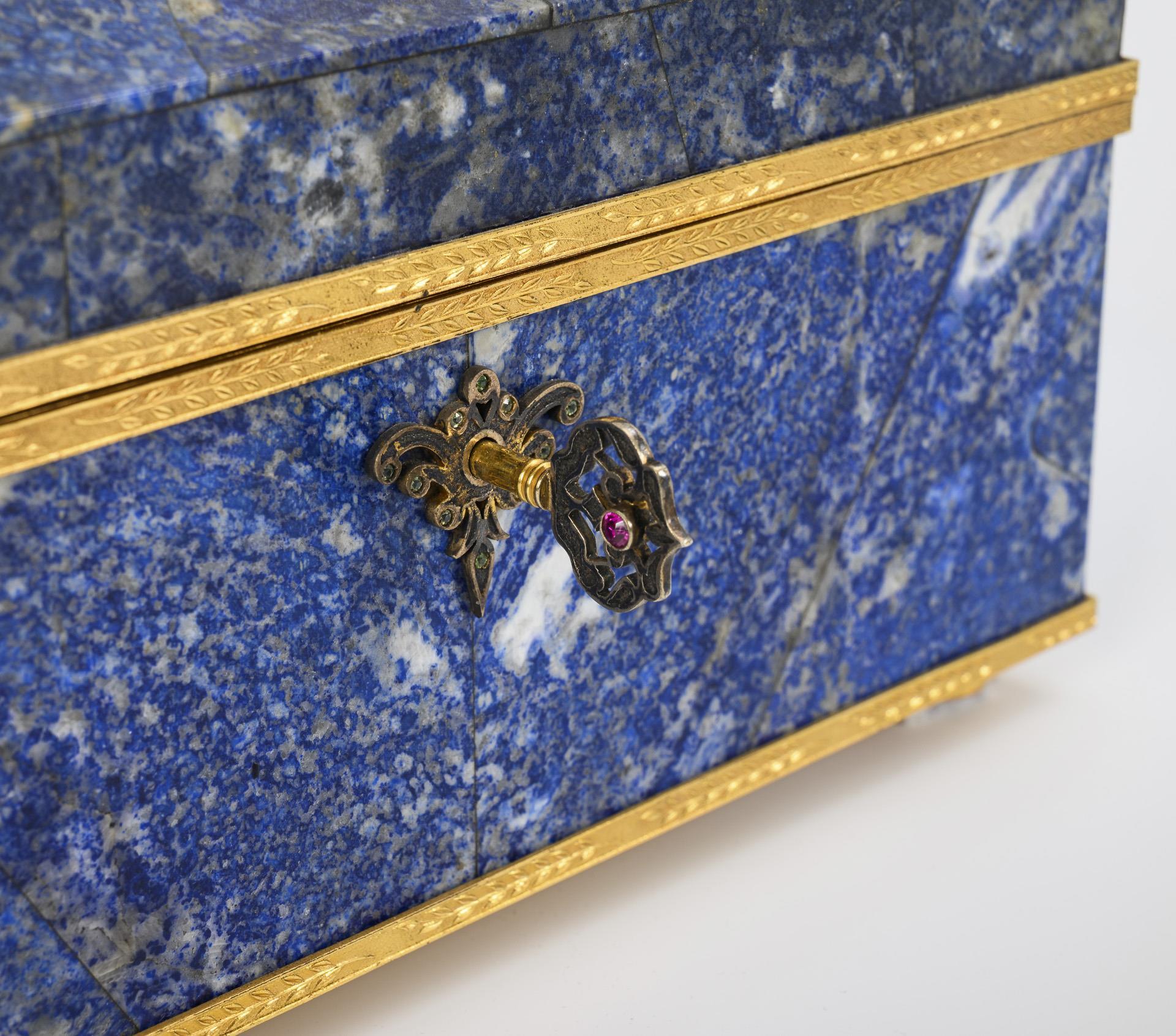 Schatulle aus vor allem am Deckel dekorativ aneinandergelegten Lapislazuli-Platten mit goldfarbenen Randbeschlägen, diese mit Blattdekor. Auf kurzen, runden Füßen stehend. Am Schlüsselloch Ausfassung mit grünen Glaspasten, der Schlüssel ist mit einer roten Glaspaste verziert. Innen gepolstert und mit dunkelrotem Samt ausgeschlagen. 2 Ecken etwas bestoßen.