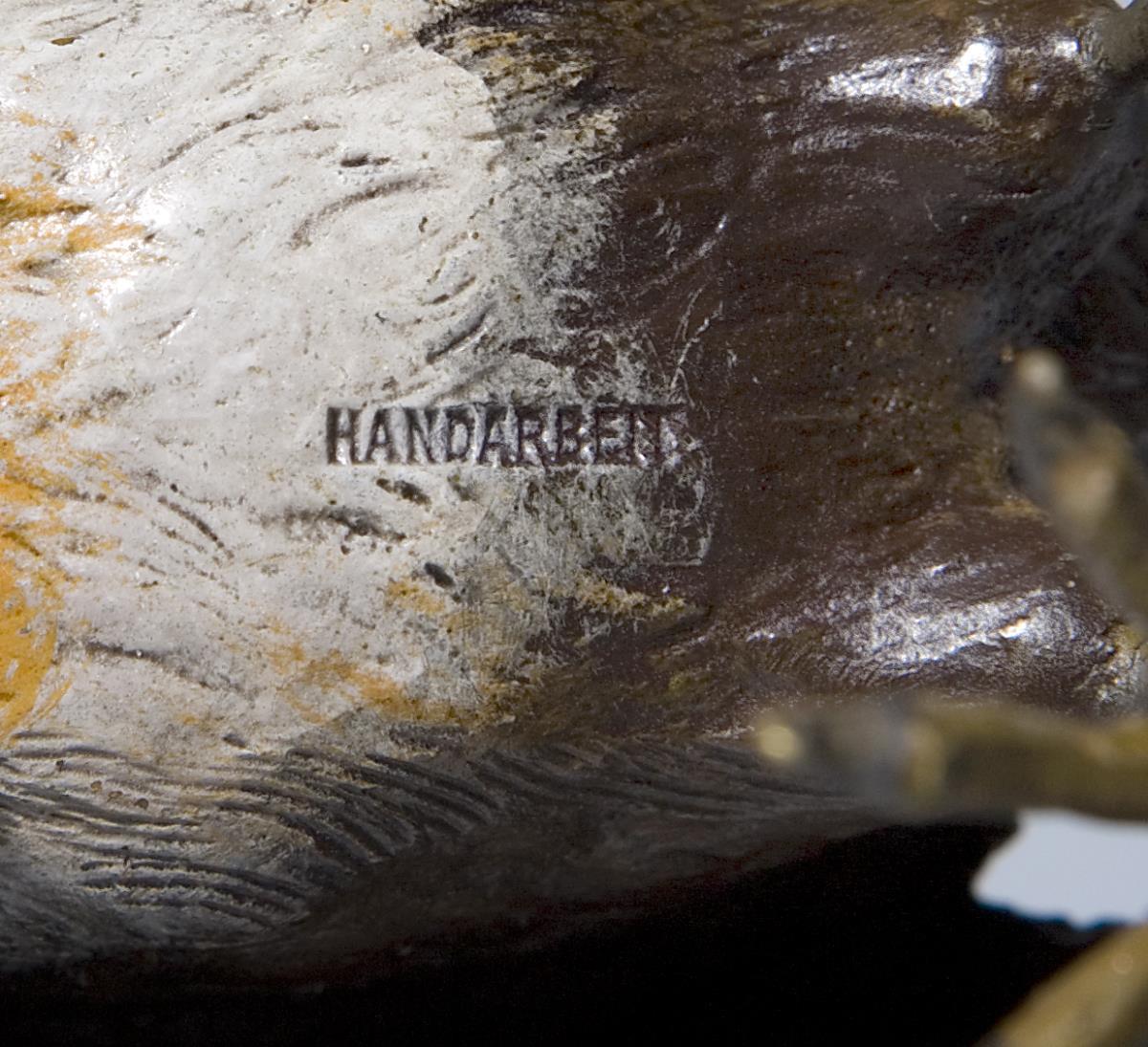 Naturalistisch modelliert und farbig bemalt; das große Rotkehlchen mit blauen Glasaugen. Das Rotkehlchen "Handarbeit" gemarkt, das kleine Rotschwänzchen undeutlich. Ein Fuß der Henne mit Zinn restauriert, partiell berieben.